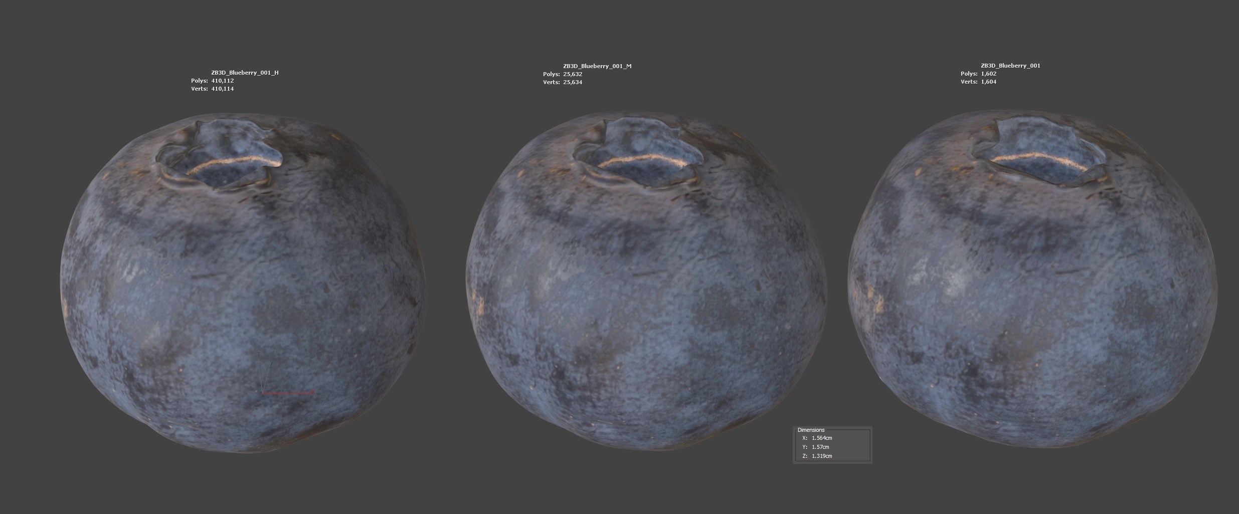 This is a legacy remastered 3d model. It was originally photo-scanned more than 10 years ago with less skill and weaker hardware. Now it has been remastered using AI upscaling for base texture, new UV unwrap, and some more details obtained through clone-stamping mesh geometry from newer blueberry scans of mine It will not be able to hold close-up renders as it lacks the critical detail. If you require a high-end blueberry scan, please check newer scans of mine or contact me for guidance.