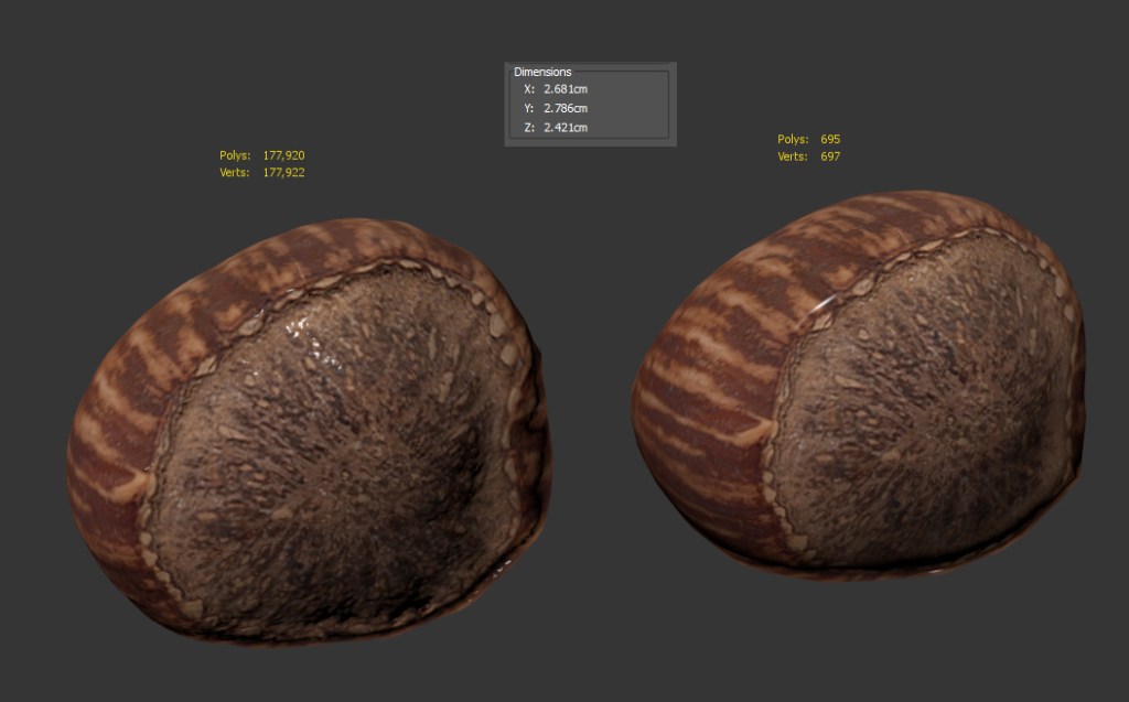 The cobnut model is presented as single mesh in 2 versions. Mesh is quad based. Base model polycount is 695. High detail model included in .max and .obj formats. High detail model has 177k quads.