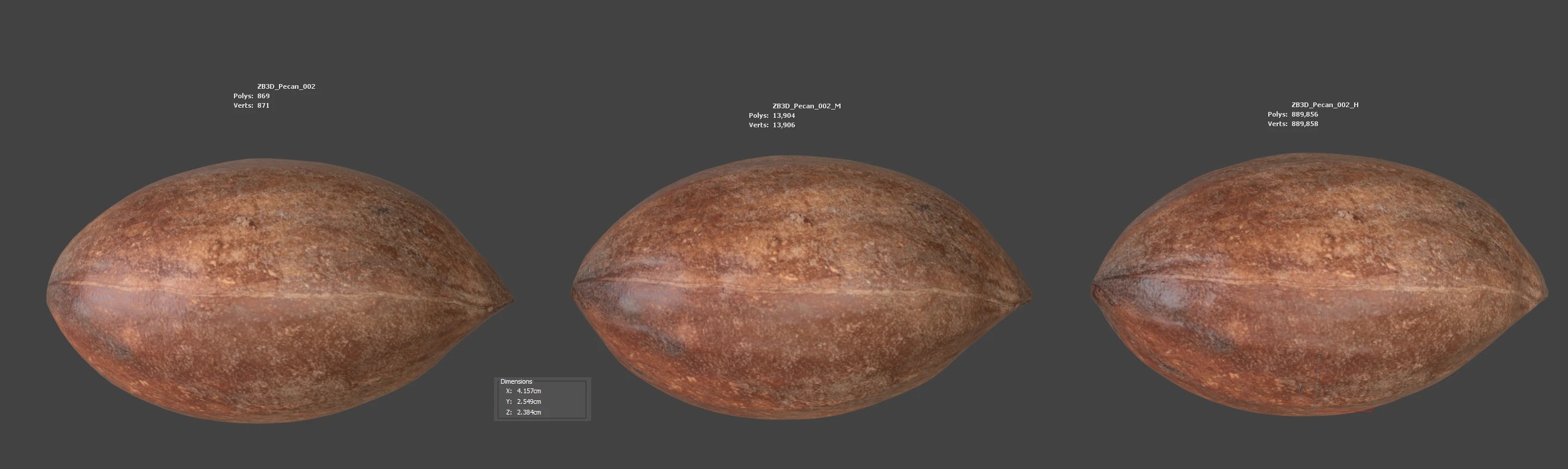 Enhance your visualizations, product designs, or still-life projects with this 3D pecan model. It boasts multiple levels of detail (869, 13K, 889K polycounts)