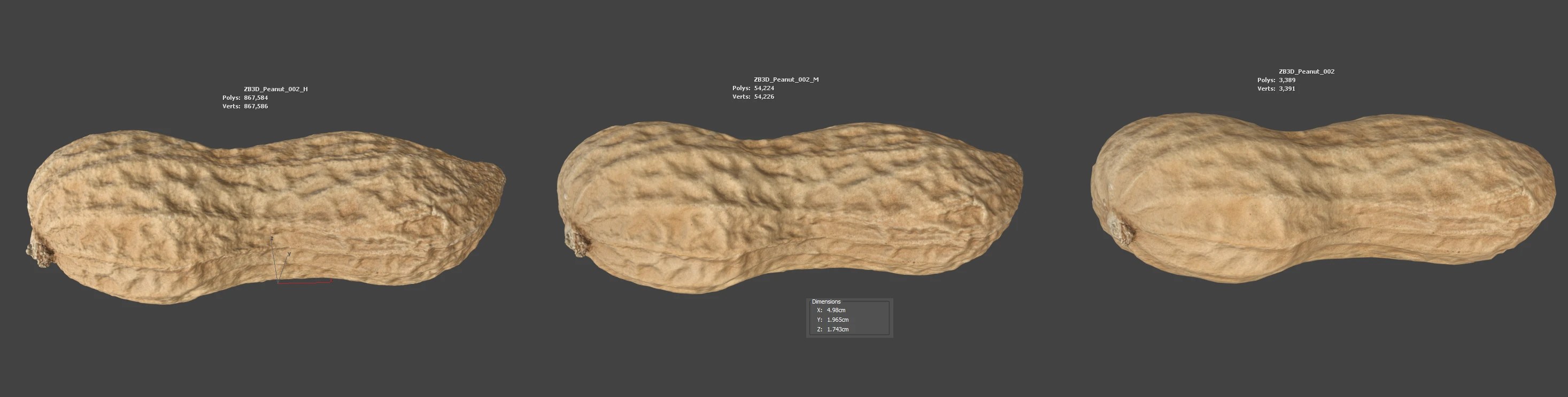 Enhance your visualizations, product designs, or still-life projects with this 3D peanut model. It boasts multiple levels of detail (3K, 54K, 867K polycounts)