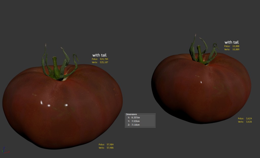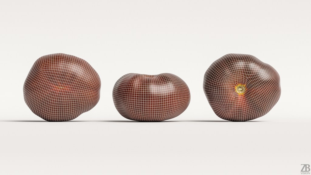 The black tomato model is presented as single mesh in 2 versions. Mesh is quad based. Base model polycount is 3624 without tail and 10K with tomato tail. High detail model included in .max and .obj formats. High detail model has 524K quads with tail. Tomato tail is a separate geometry.