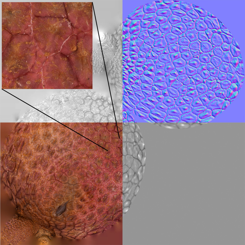 5 maps are supplied with this model. 8192×8192 PNGs and 2048×2048 JPGs. The maps include diffuse, AO, specular, normal, displacement. The litchi model is uvw unwrapped.