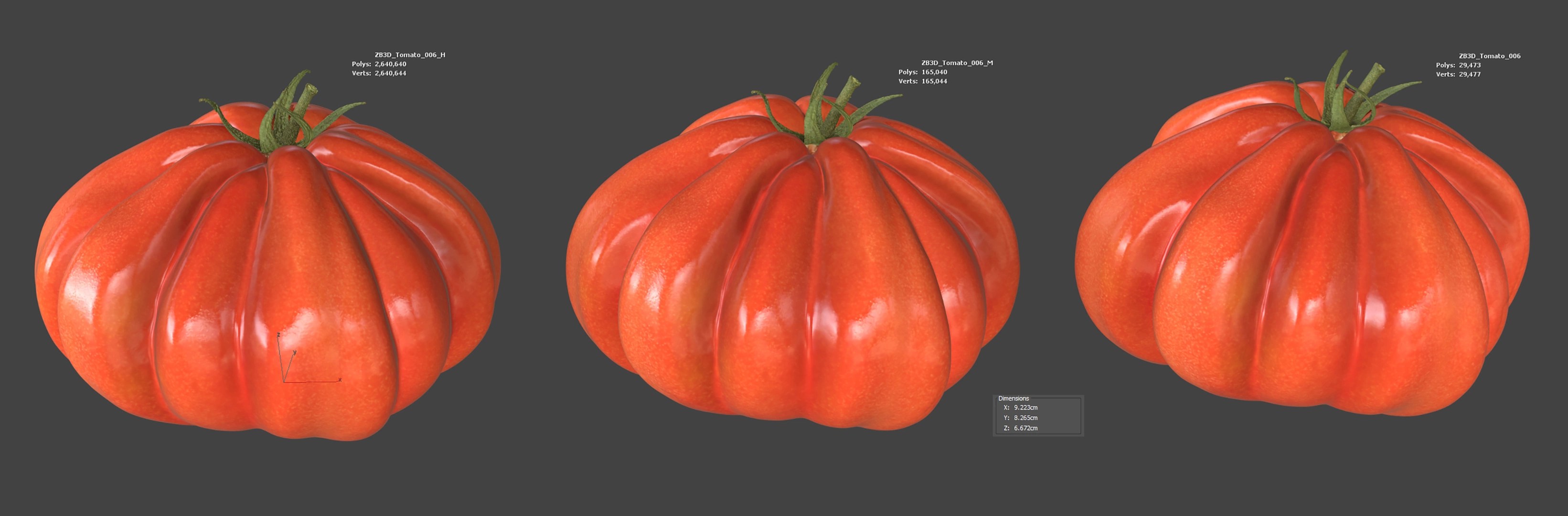 Enhance your visualizations, product designs, or still-life projects with this ultra-realistic 3D tomato model. Meticulously photogrammetry scanned and textured, it boasts multiple levels of detail (29K, 165K, 2640K polycounts) for close-ups and broader scenes.