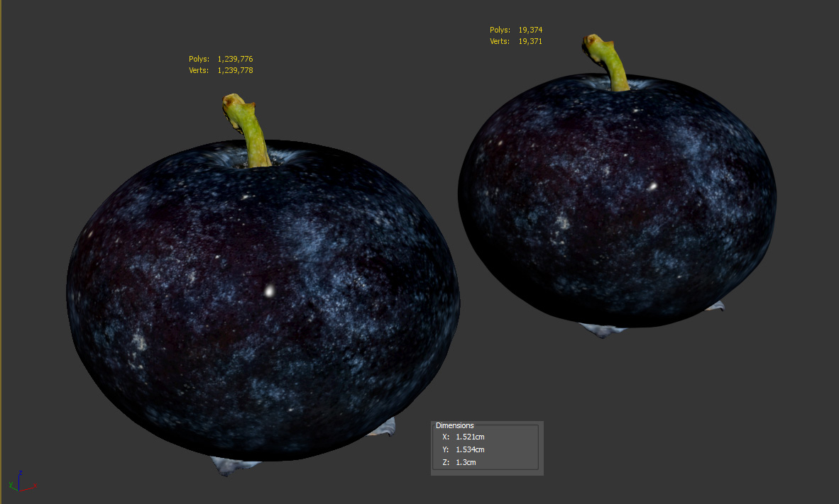 The blueberry model is presented as single mesh in 2 versions. Mesh is quad based. Base model polycount is 19374. High detail model included in .max and .obj formats. High detail model has 1239K quads.