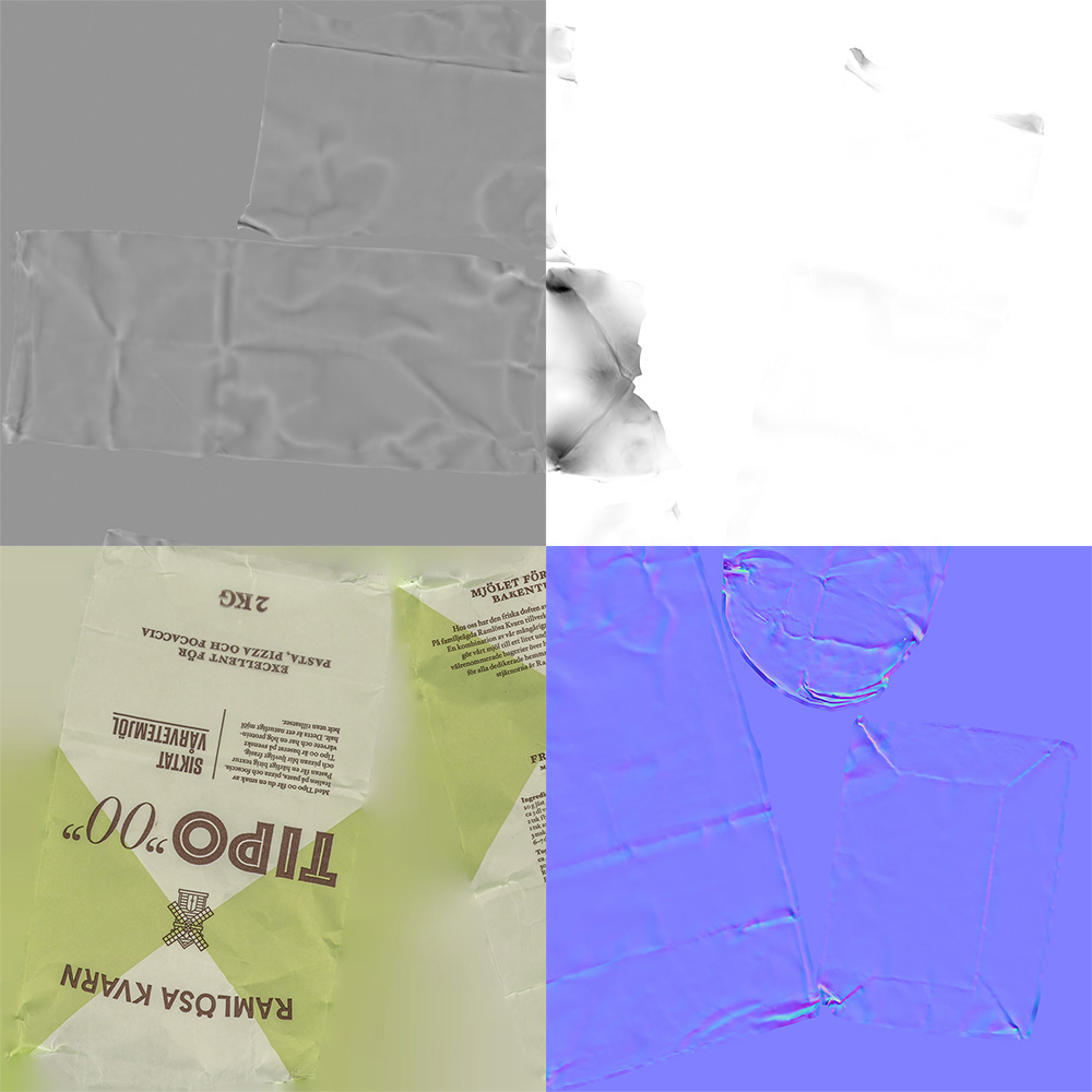 4 maps are supplied with this model. 8192×8192 PNGs and 2048×2048 JPGs. The maps include diffuse, AO, normal, displacement. The flour paper bag model is uvw unwrapped.