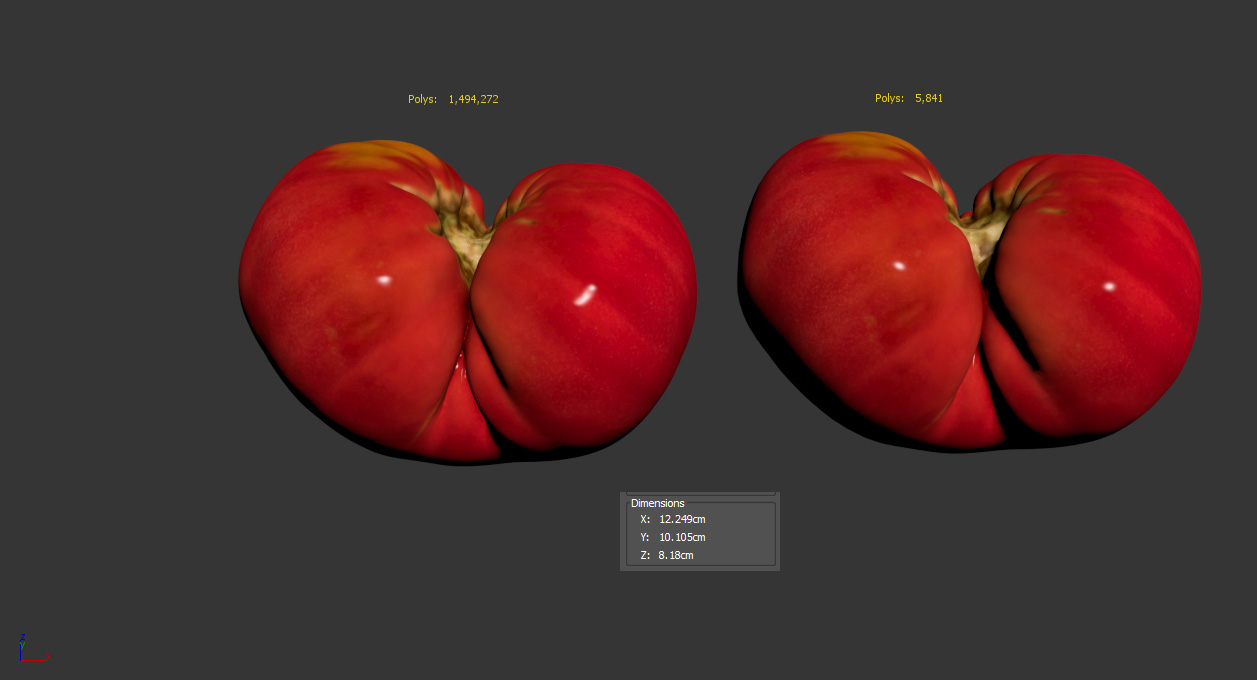 The tomato model is presented as single mesh in 2 versions. Mesh is quad based. Base model polycount is 6K. High detail model included in .max and .obj formats. High detail model has 1494k quadsl.