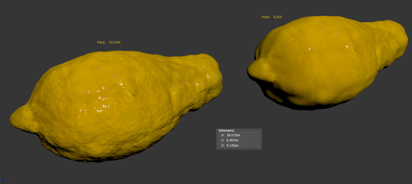 The citrus lemon model is presented as single mesh in 2 versions. Mesh is quad based. Base model polycount is 6k. High detail model included in .max and .obj formats. High detail model has 313k quads.