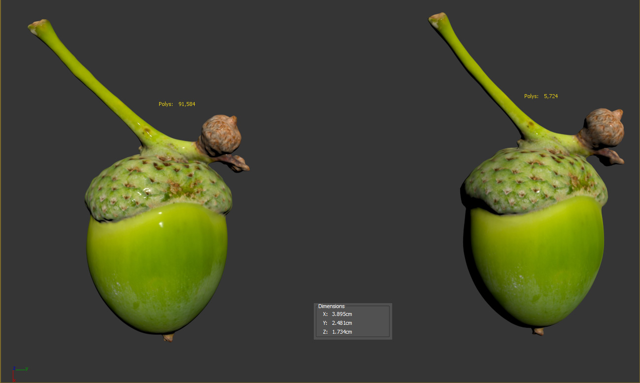 The oak acorn model is presented as single mesh in 2 versions. Mesh is quad based. Base model polycount is 5724. High detail model included in .max and .obj formats. High detail model has 91k quads.