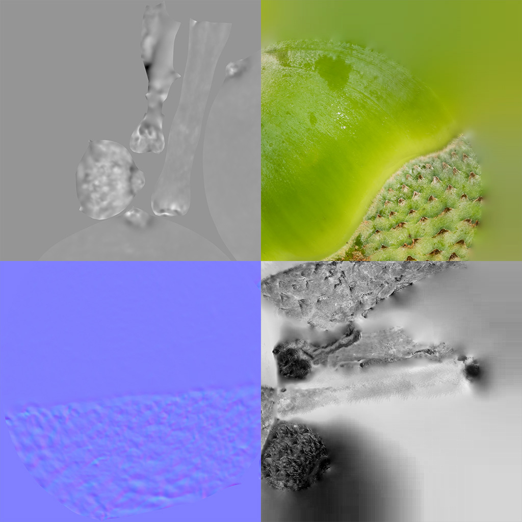 5 maps are supplied with this model. 8192×8192 PNGs and downsampled versions in 2048×2048 JPGs. The maps include ao, diffuse, specular, normal, displacement. A 16K diffuse texture is also included. The acorn nut model is uvw unwrapped.