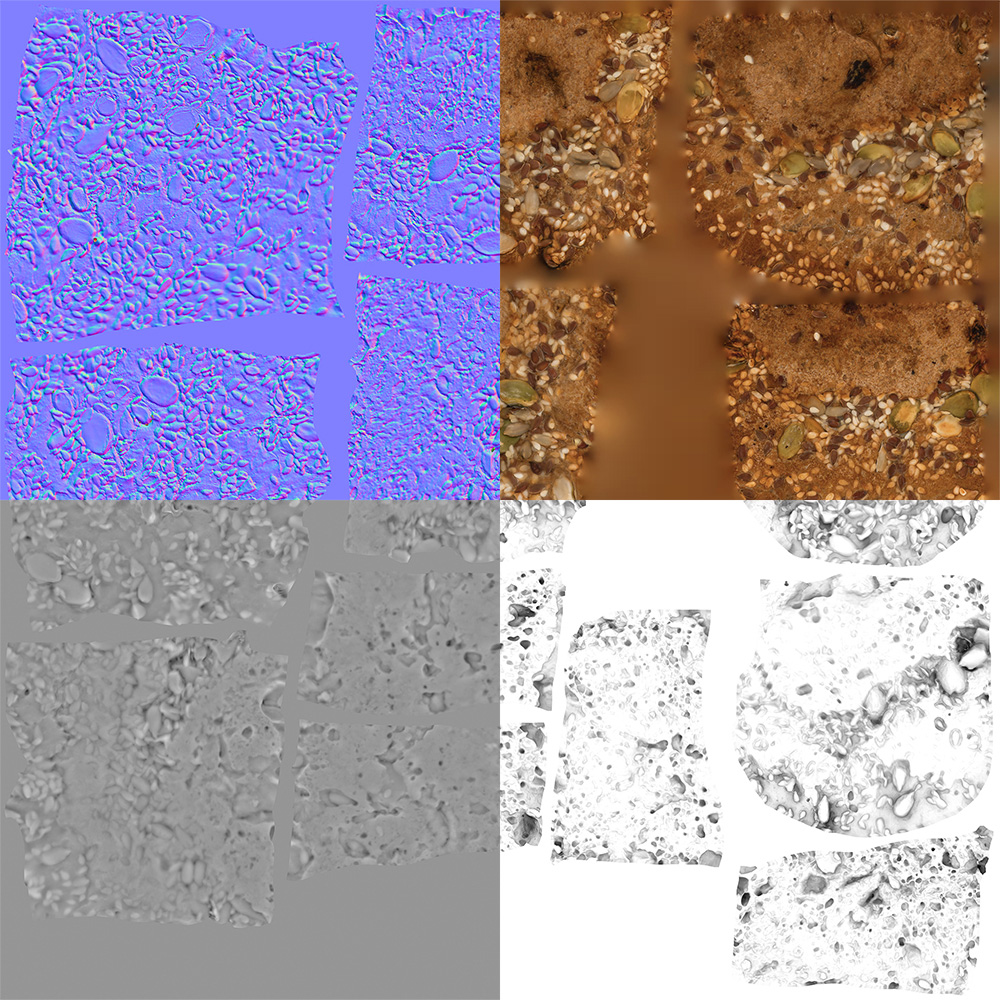 5 maps are supplied with this model. 8192×8192 PNGs and downsampled versions in 2048×2048 JPGs. The maps include ao, diffuse, specular, normal, displacement. A 16K diffuse texture is also included. The bread model is uvw unwrapped.