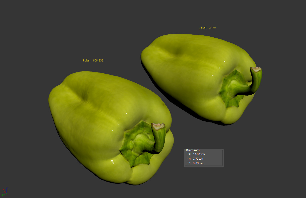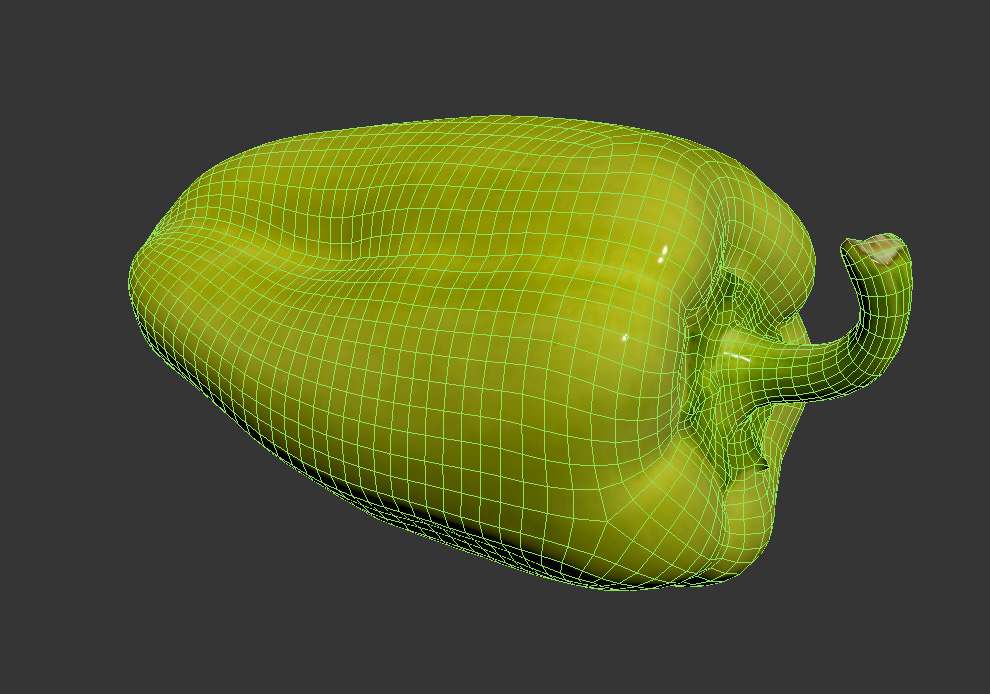 The pimento pepper model is presented as single mesh in 2 versions. Mesh is quad based. Base model polycount is 3297. High detail model included in .max and .obj formats. High detail model has 808k quads.