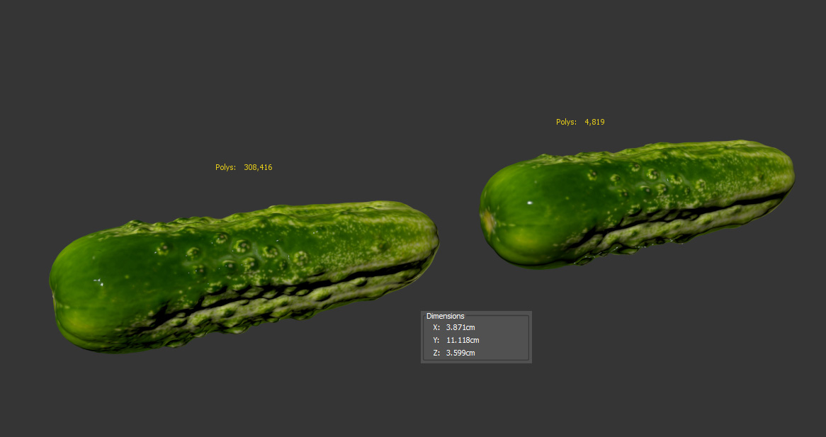 The cucumber model is presented as single mesh in 2 versions. Mesh is quad based. Base model polycount is 4819. High detail model included in .max and .obj formats. High detail model has 308k quads.