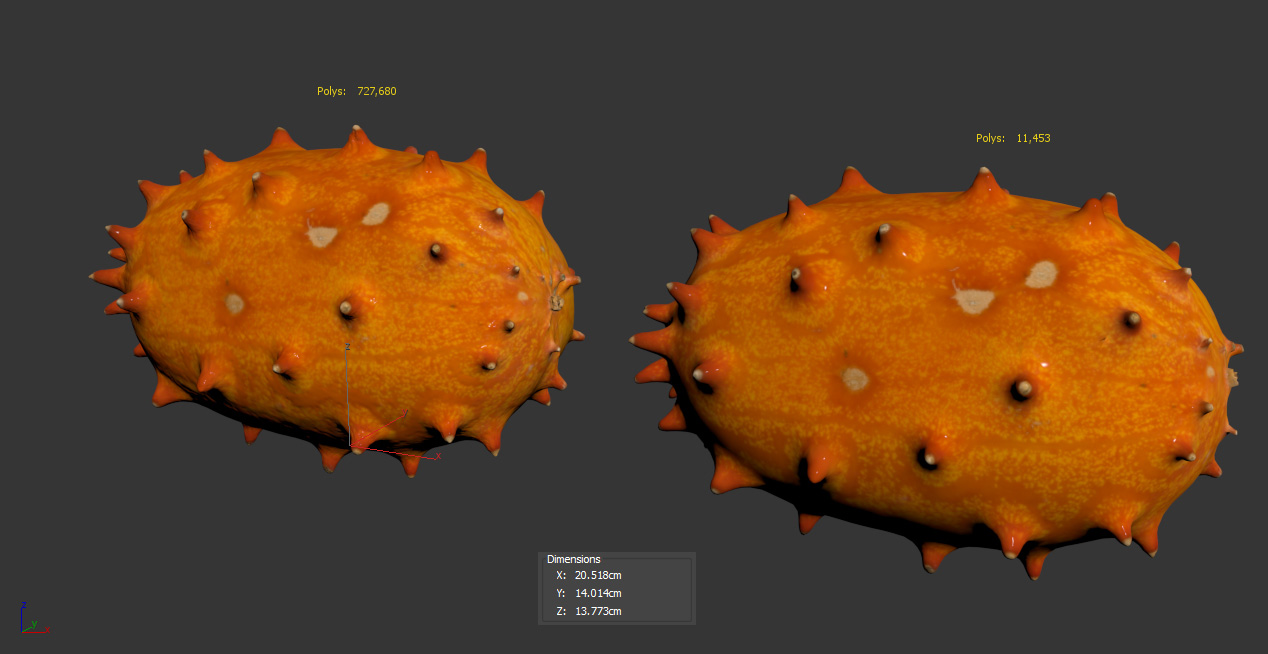 The kiwano melano model is presented as single mesh in 2 versions. Mesh is quad based. Base model polycount is 11453. High detail model included in .max and .obj formats. High detail model has 727k quads.