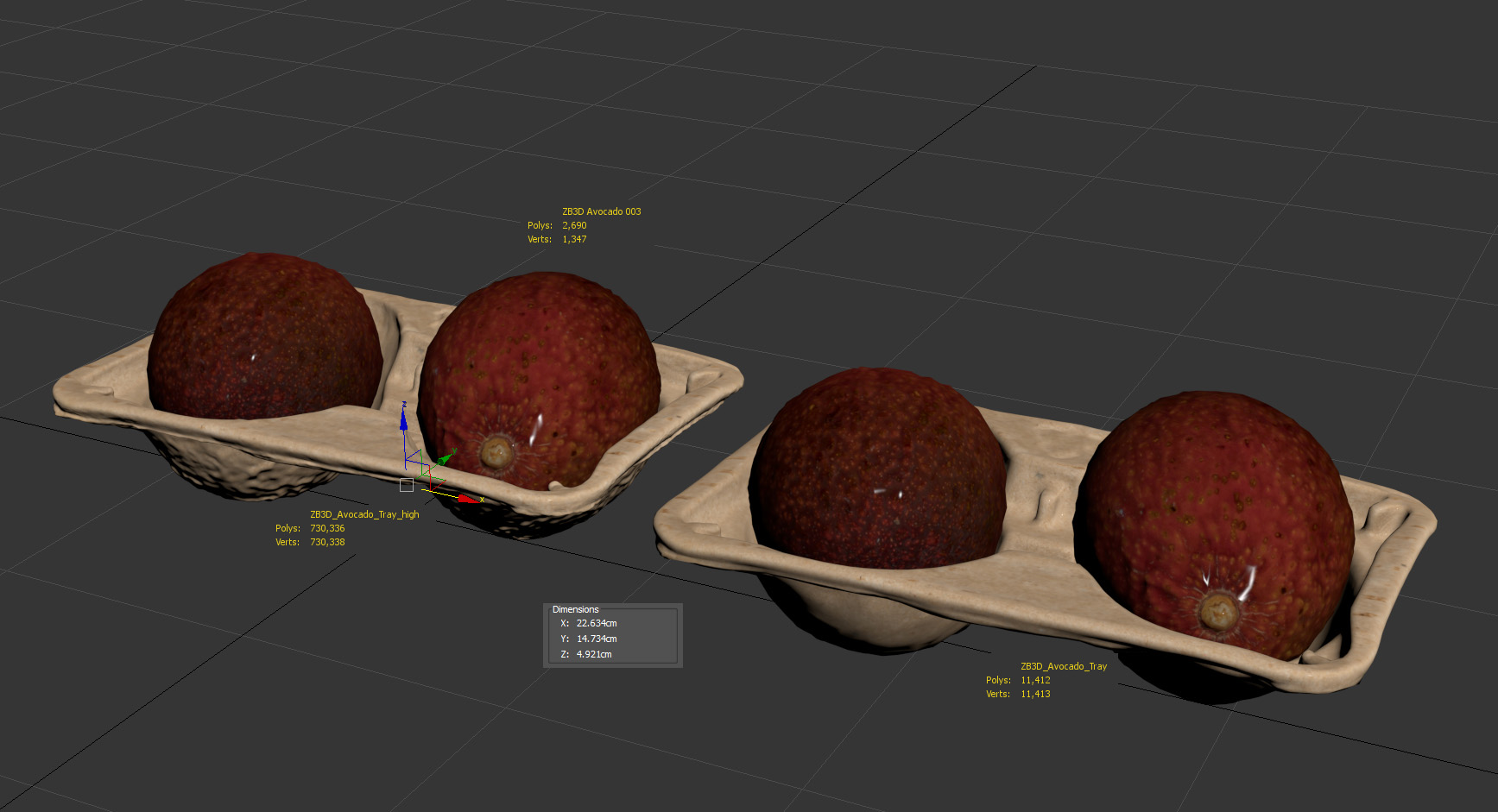 The avocado paper tray model is presented as single mesh in 2 versions: low and high. Mesh is quad based. Base low model polycount is 11412. Low and High detail model included in .max, .fbx and .obj formats. High detail model has 730k quads. The avocado fruit model is presented as single mesh in lowpoly version. It has 2690 quads. If you need highpoly version of this avocado please check my profile. Avocado 003.