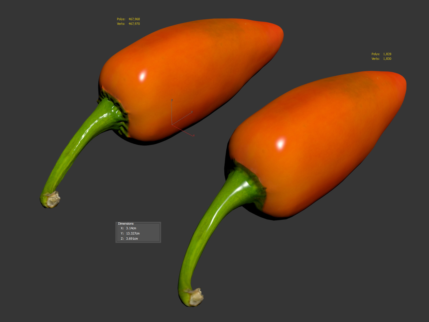 The green pepper model is presented as single mesh in 2 versions: low and high. Mesh is quad based. Base low model polycount is 1828. Low and High detail model included in .max, .fbx and .obj formats. High detail model has 467k quads.