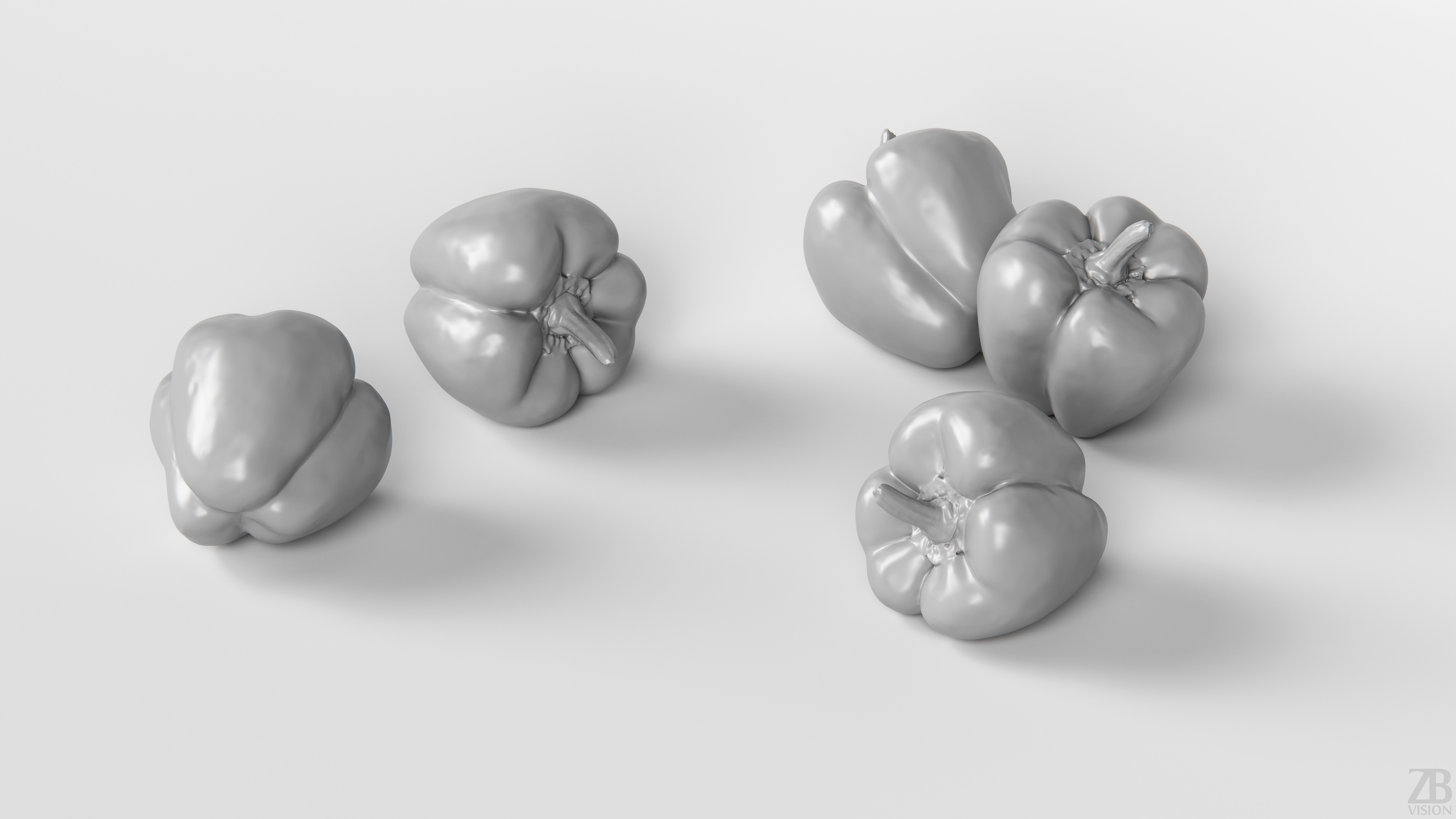 6 maps are supplied with this model. 8192×8192 PNGs and downsampled versions in 2048×2048 JPGs. The maps include ao, diffuse, glossiness, normal,sss amount and displacement. A 16K diffuse texture is also included. The pimiento pepper model is uvw unwrapped.