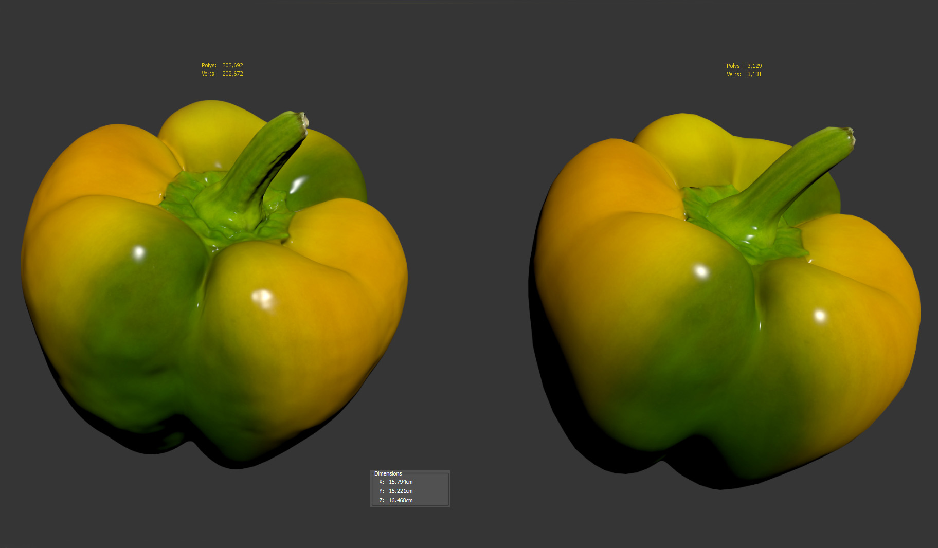 The pimento pepper model is presented as single mesh in 2 versions. Mesh is quad based. Base model polycount is 3129. High detail model included in .max, .fbx and .obj formats. High detail model has 202k quads.