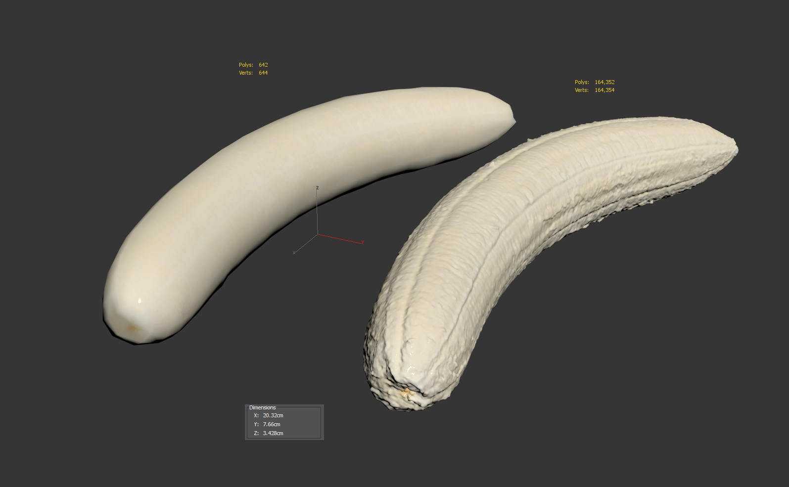 The banana model is presented as single mesh in 2 versions: low and high. Mesh is quad based. Base low model polycount is 642. Low and High detail model included in .max, .fbx, .stl and .obj formats. High detail model has 164k quads.