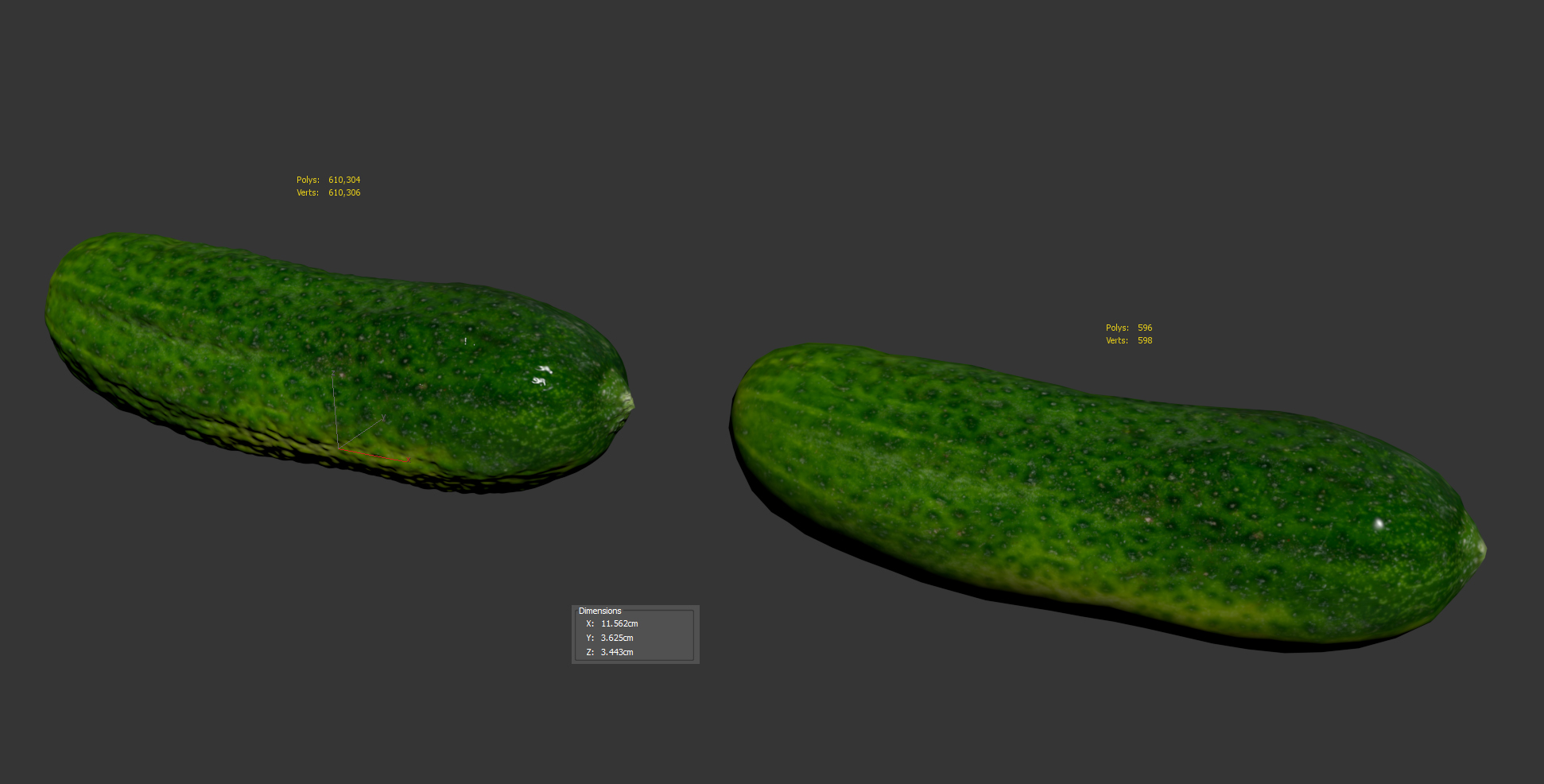 The cucumber model is presented as single mesh in 2 versions: low and high. Mesh is quad based. Base low model polycount is 596. Low and High detail model included in .max, .fbx, .stl and .obj formats. High detail model has 610k quads.