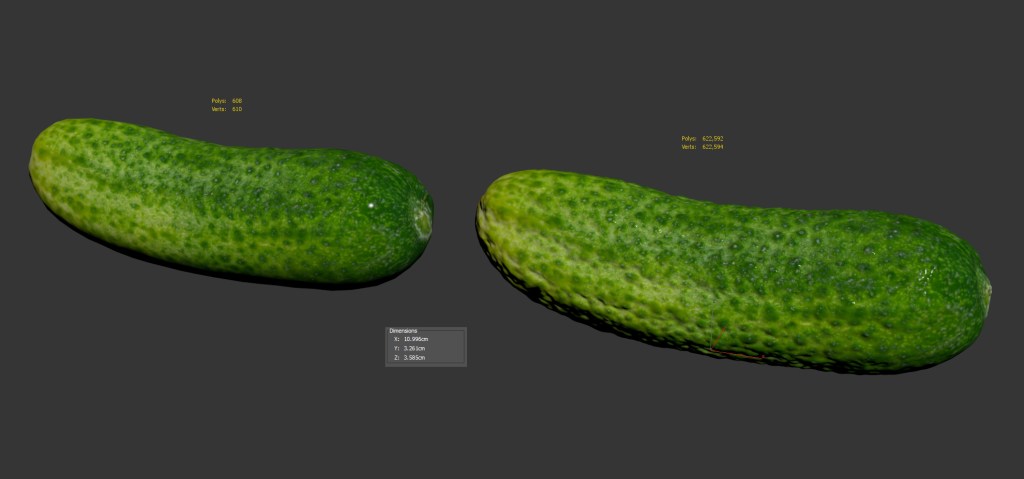 The cucumber model is presented as single mesh in 2 versions: low and high. Mesh is quad based. Base low model polycount is 608. Low and High detail model included in .max, .fbx, .stl and .obj formats. High detail model has 622k quads.