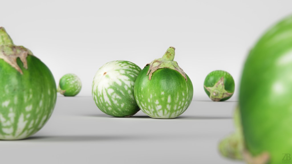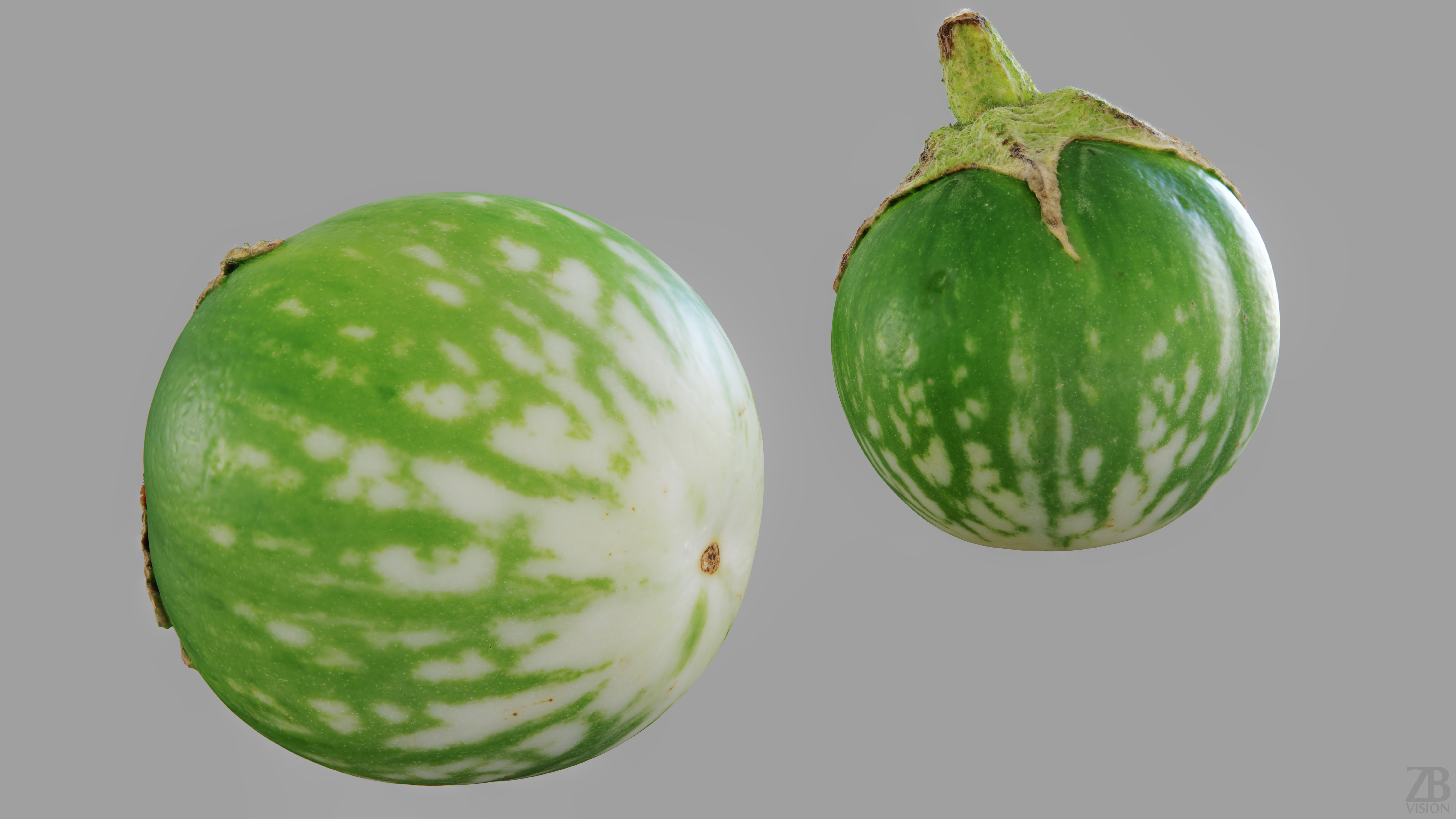 This is a 3d model of a thai apple eggplant. It was scanned and prepared for photorealistic renderings, close-ups, stills and animation. The green eggplant model is ready to be inserted in your scene out of the box.