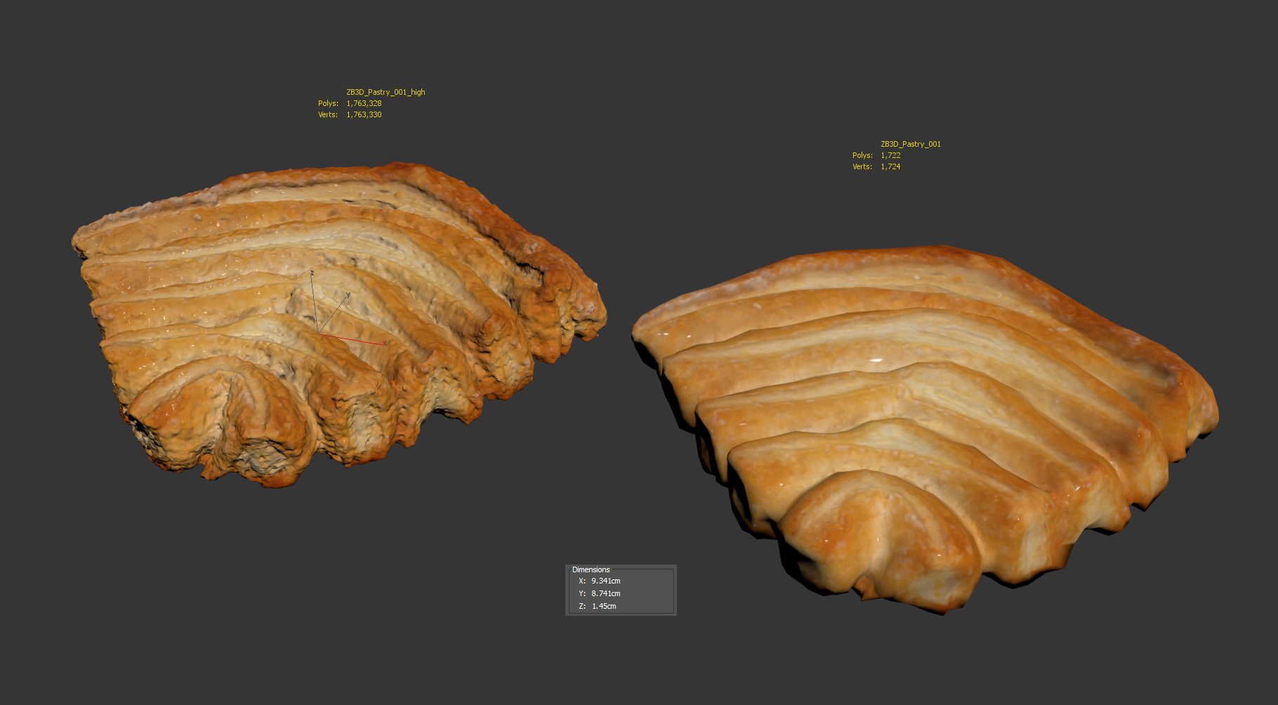 The pastry model is presented as a single mesh in 2 versions. Mesh is quad-based. The base model polycount is 1722. The high-detail model included in .max, .fbx, .stl, and .obj formats. High detail model has 1763k quads.