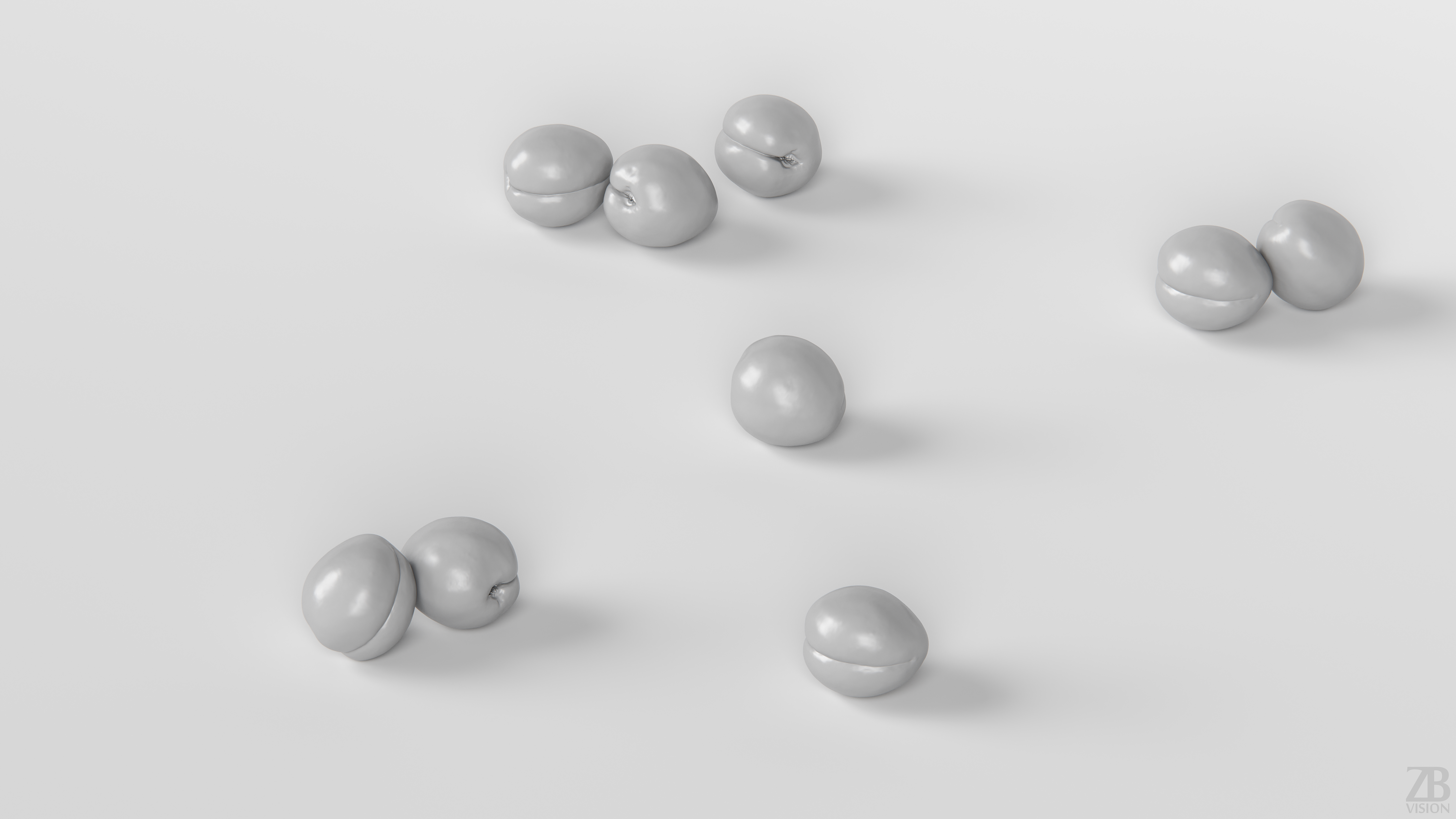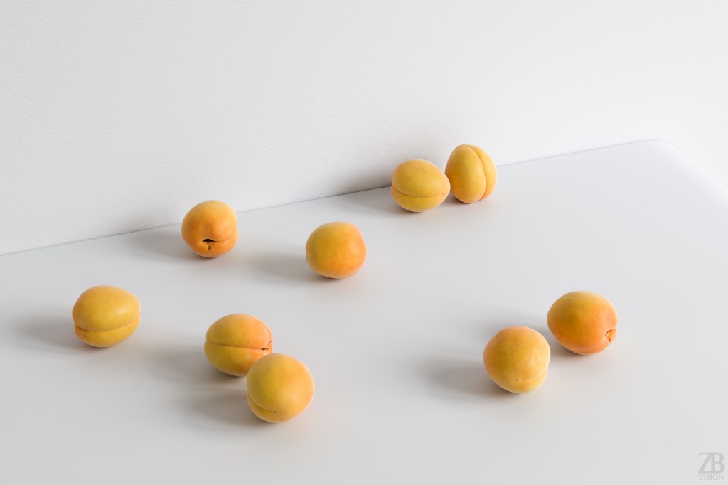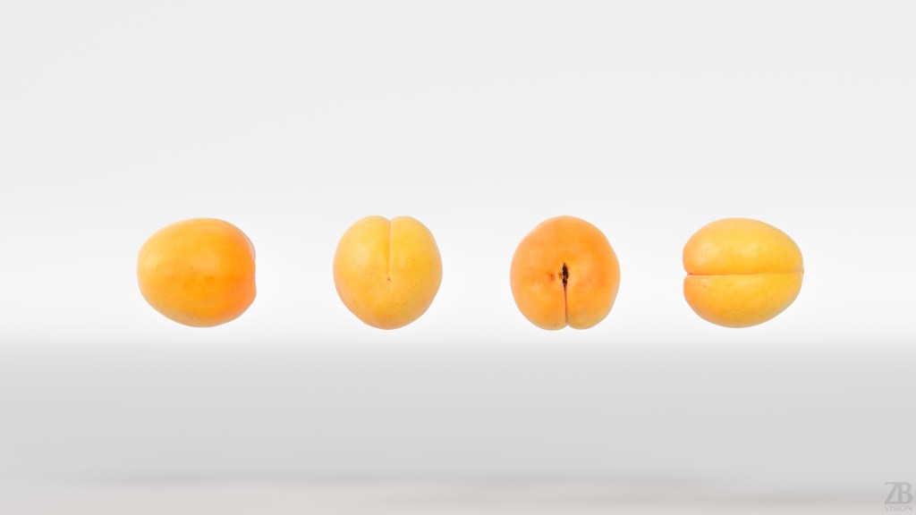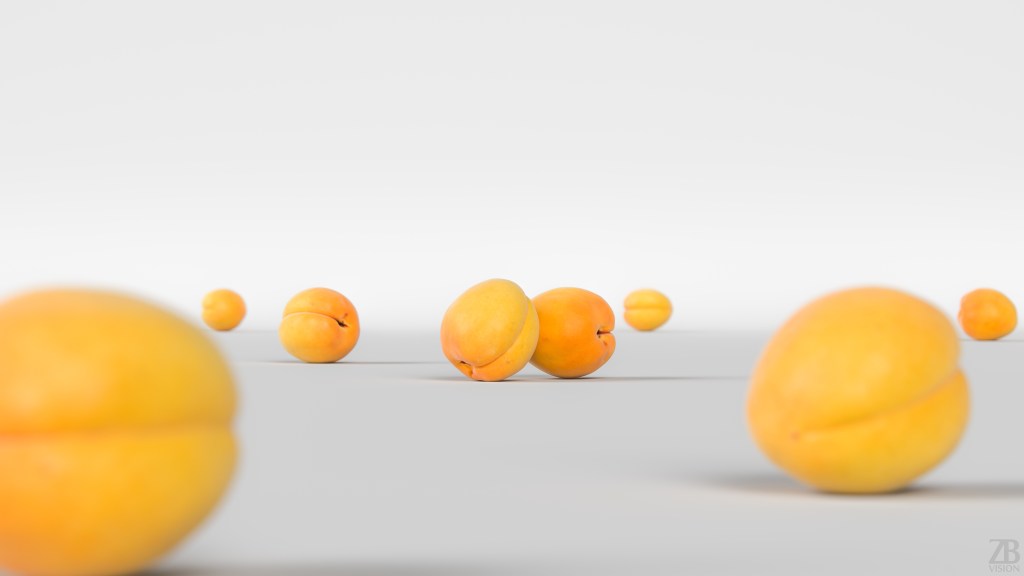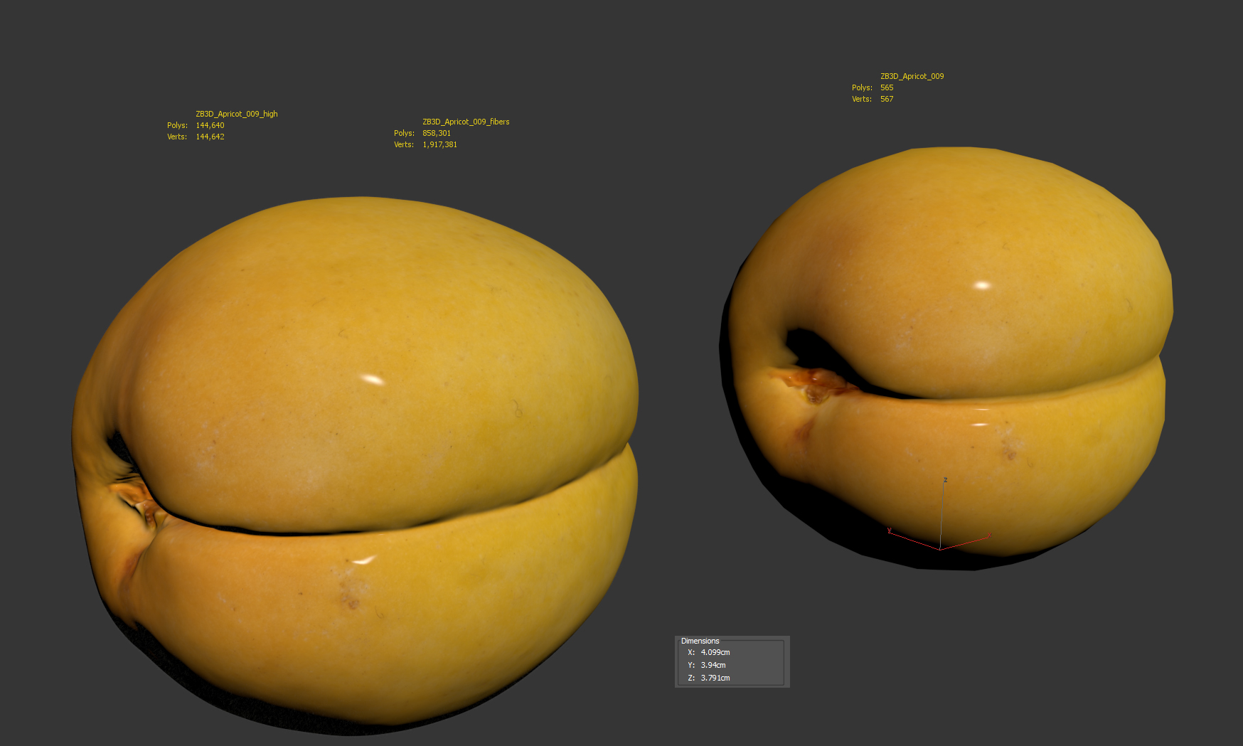 The aprikos model is presented as single mesh in 2 versions: low and high. Mesh is quad based. Base low model polycount is 565. High detail model included in .max, .fbx, .stl and .obj formats. High detail model has 144k quads. High model has a separate geometry comprised of little fibers/fur that is present on the surface of the fruit – polycount for this mesh is 858k. It can be deleted/hidden in case no closeups are needed.