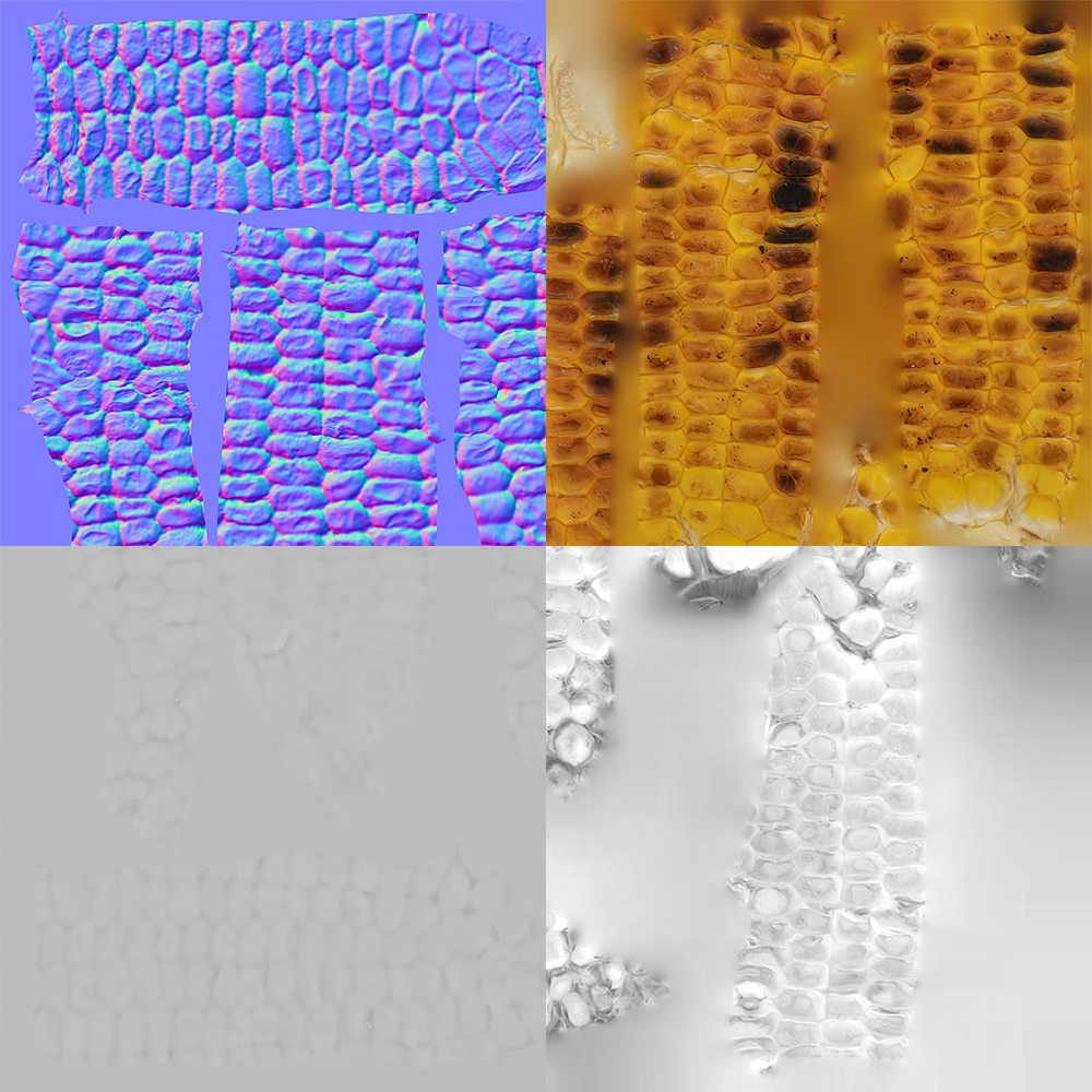 5 maps are supplied with this model. 8192×8192 PNGs and downsampled versions in 2048×2048 JPGs. The maps include ao, diffuse, glossiness, normal and displacement(tif). A 16K diffuse texture map is also included. The grilled corn model is uvw unwrapped.