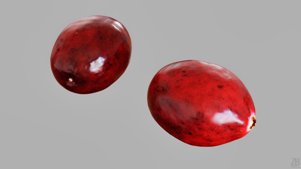 This is a 3d model of a cranberry. It was scanned and prepared for photorealistic renderings, close-ups, stills and animation. The cranberry model is ready to be inserted in your scene out of the box.