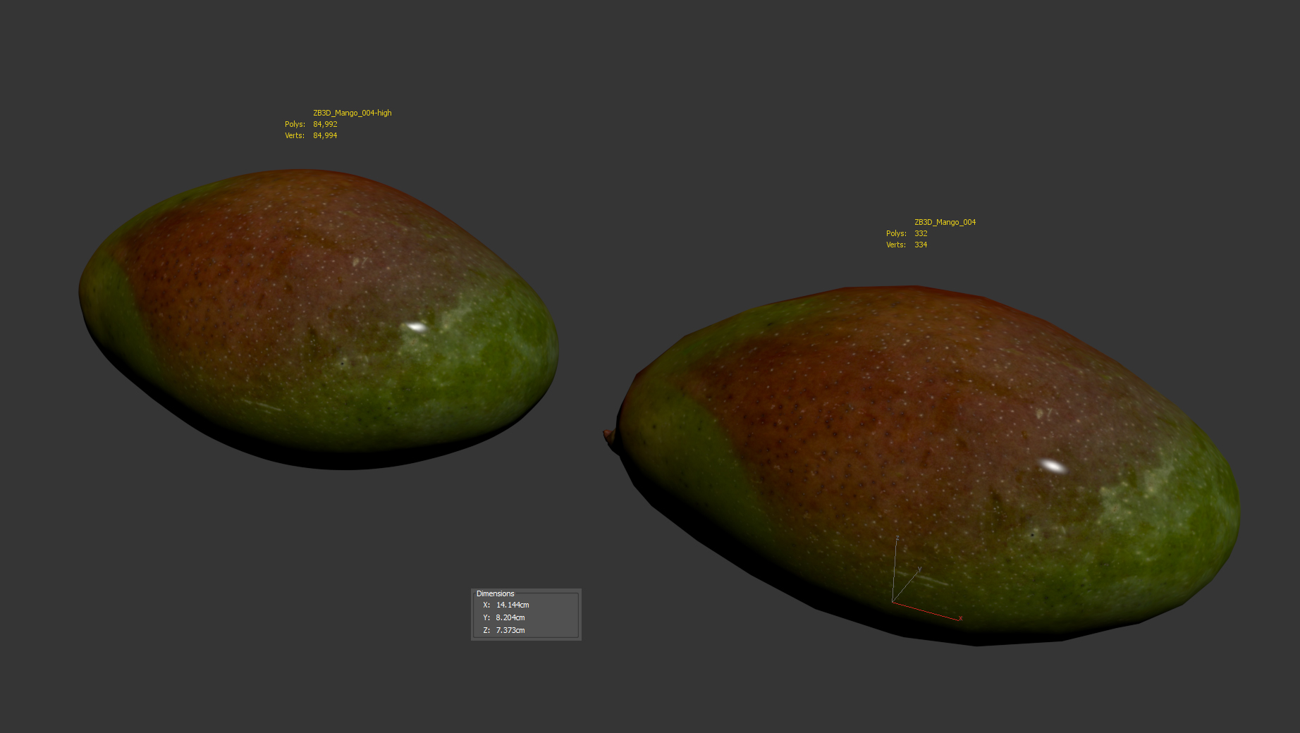 The mango model is presented as single mesh in 2 versions: low and high. Mesh is quad based. Base low model polycount is 332. High detail model included in .max, .fbx, .stl and .obj formats. High detail model has 84k quads.