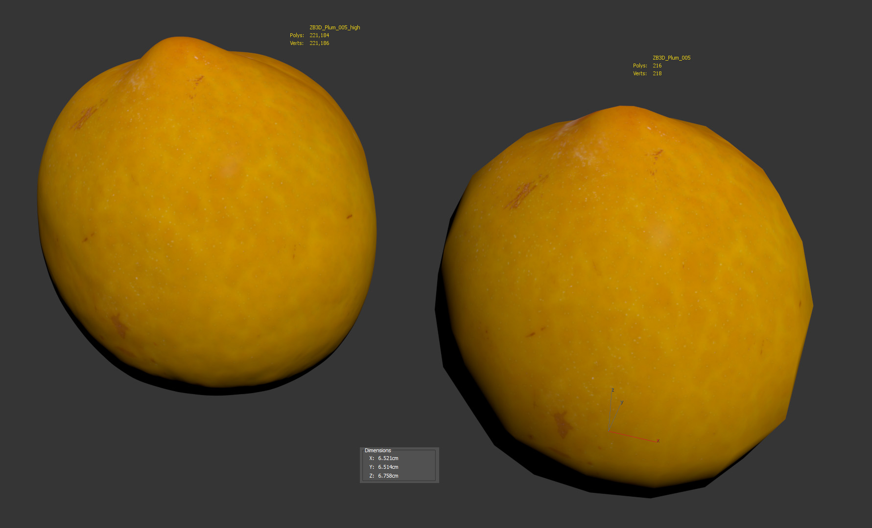 The plum model is presented as single mesh in 2 versions: low and high. Mesh is quad based. Base low model polycount is 216. High detail model included in .max, .fbx, .stl and .obj formats. High detail model has 221k quads.