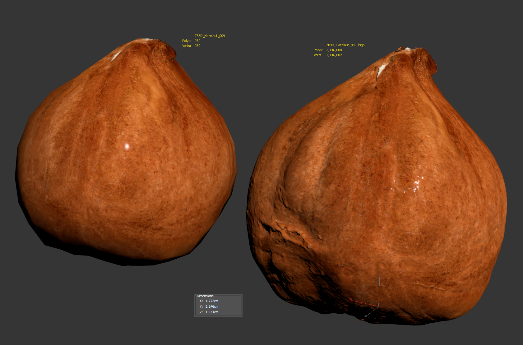 The hazelnut model is presented as single mesh in 2 versions: low and high. Mesh is quad based. Base low model polycount is 240. High detail model included in .max, .fbx, c4d, .stl and .obj formats. High detail model has 3932k quads.