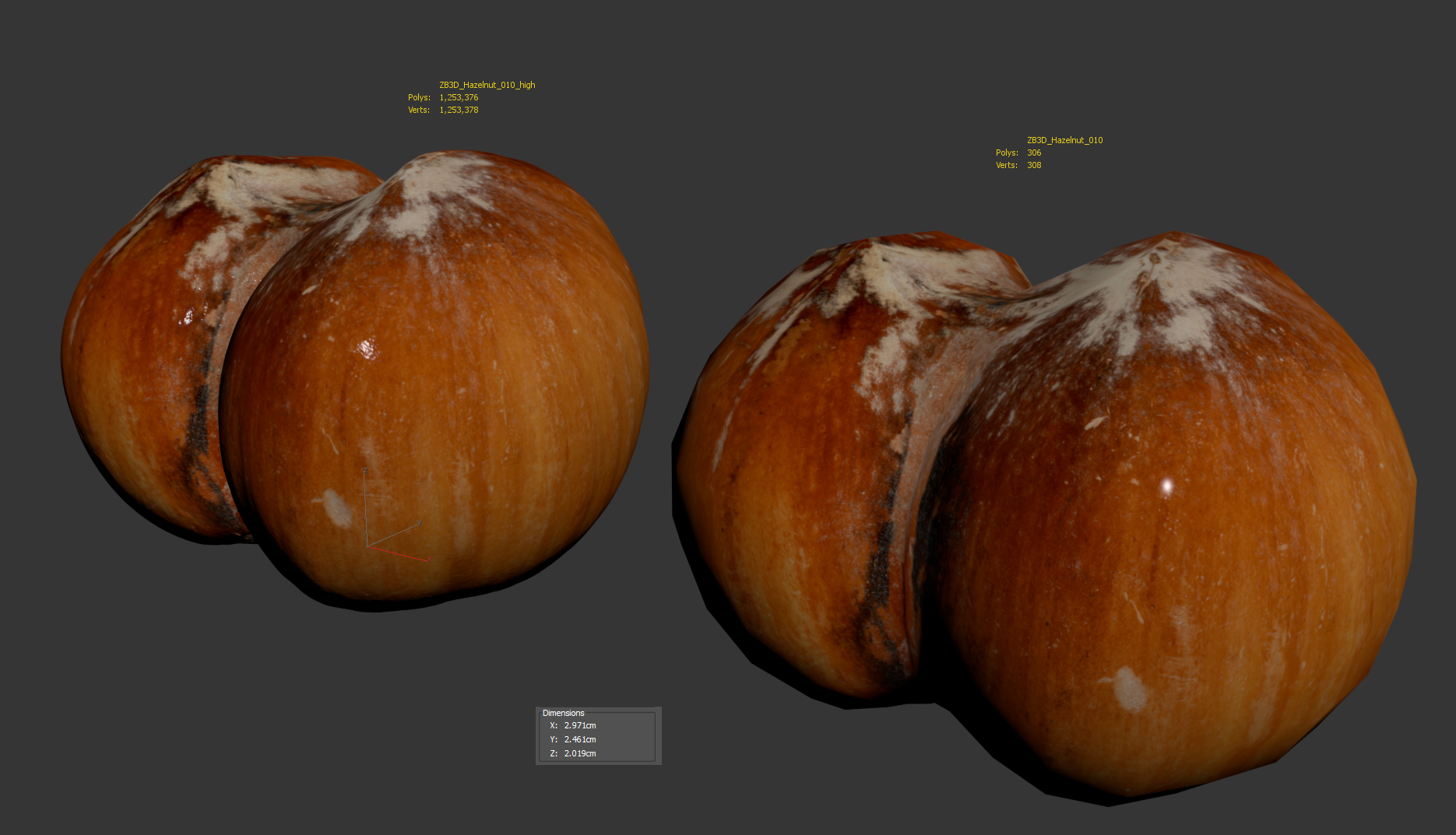 The hazelnut model is presented as single mesh in 2 versions: low and high. Mesh is quad based. Base low model polycount is 306. High detail model included in .max, .fbx, c4d, .stl and .obj formats. High detail model has 1253k quads.
