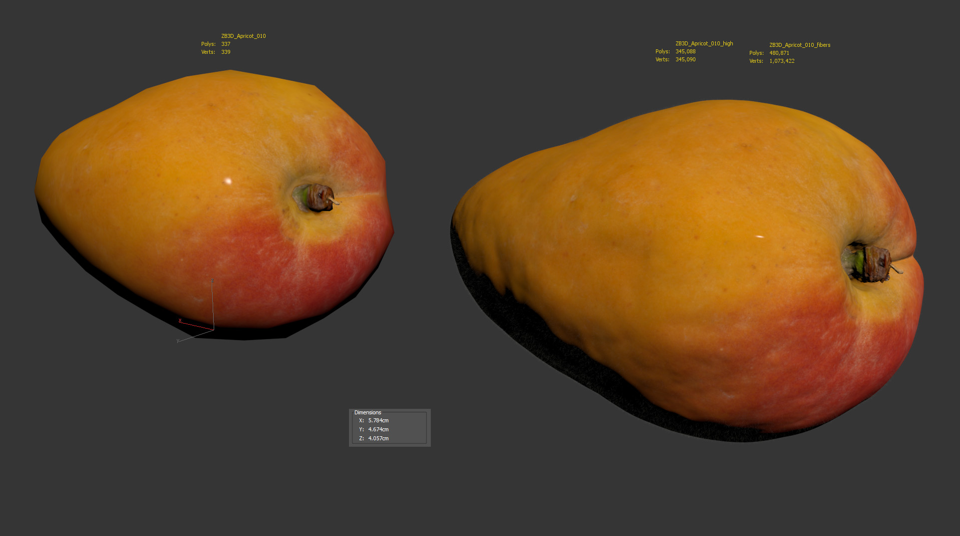 The aprikos model is presented as single mesh in 2 versions: low and high. Mesh is quad based. Base low model polycount is 337. High detail model included in .max, .fbx, .c4d, .stl and .obj formats. High detail model has 345k quads. High model has a separate geometry comprised of little fibers/fur that is present on the surface of the fruit – polycount for this mesh is 480k. It can be deleted/hidden in case no closeups are needed.