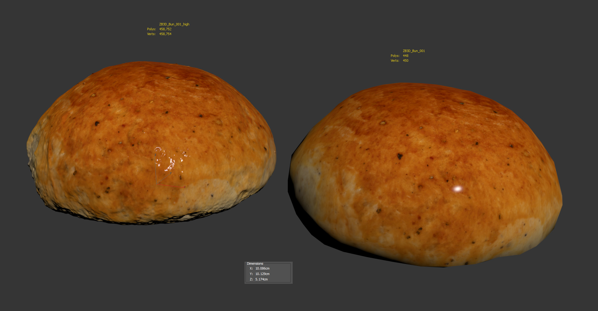 The bun model is presented as single mesh in 2 versions: low and high. Mesh is quad based. Base low model polycount is 448. High detail model included in .max, .fbx, .c4d, .stl and .obj formats. High detail model has 458k quads.