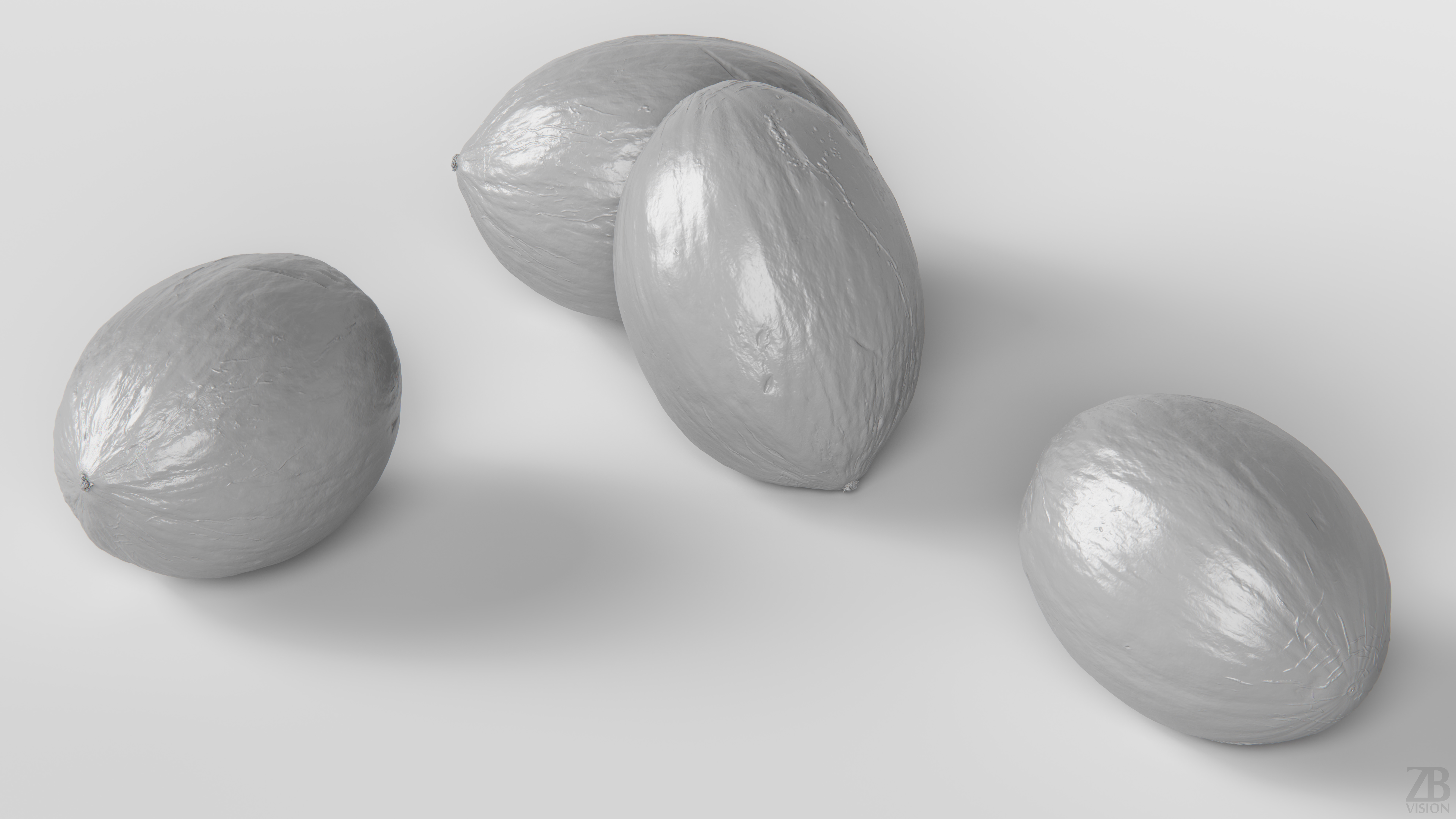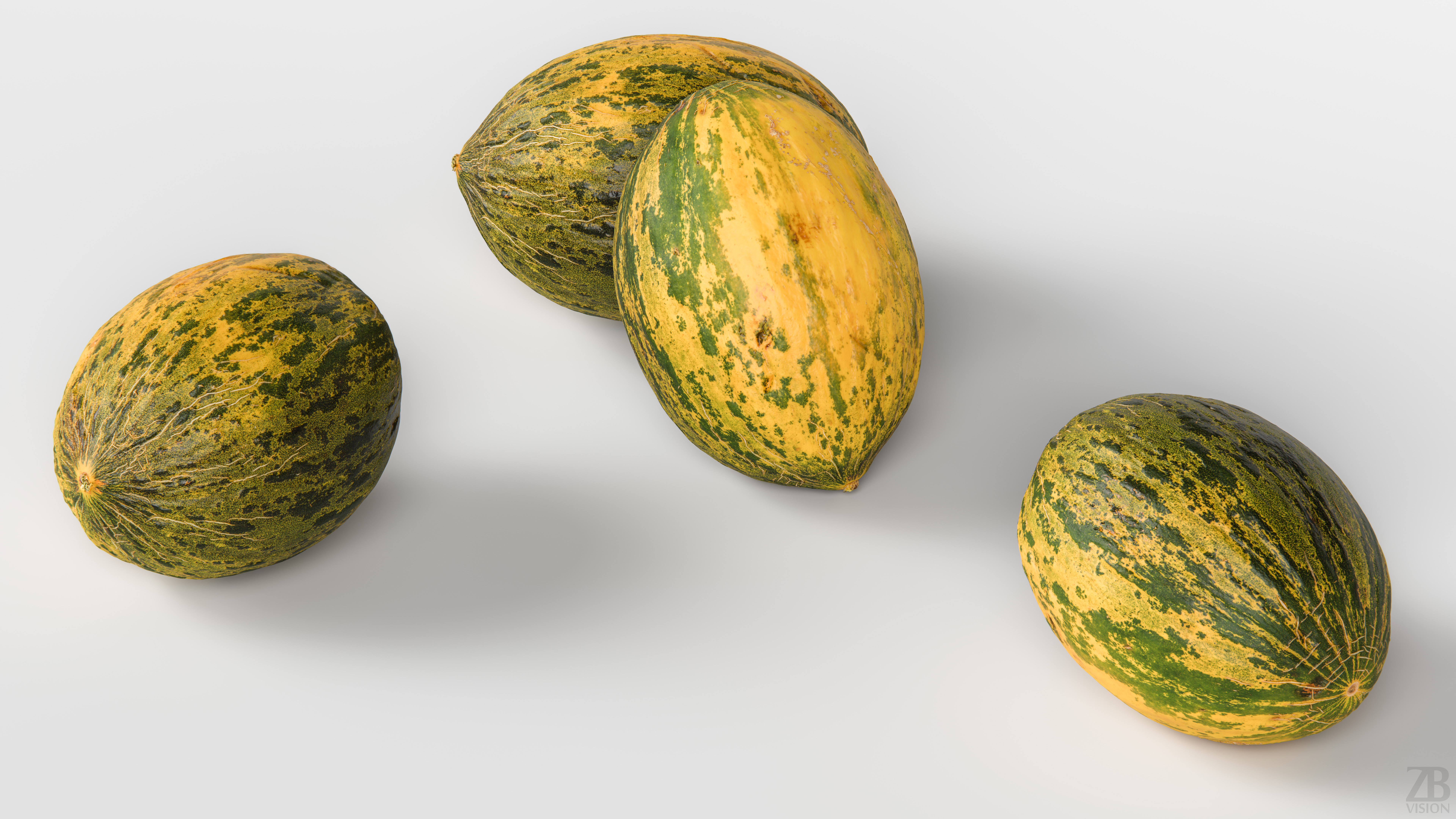 The melon model is presented as single mesh in 2 versions: low and high. Mesh is quad based. Base low model polycount is 796. High detail model included in .max, .fbx, .c4d, .stl and .obj formats. High detail model has 3260k quads.