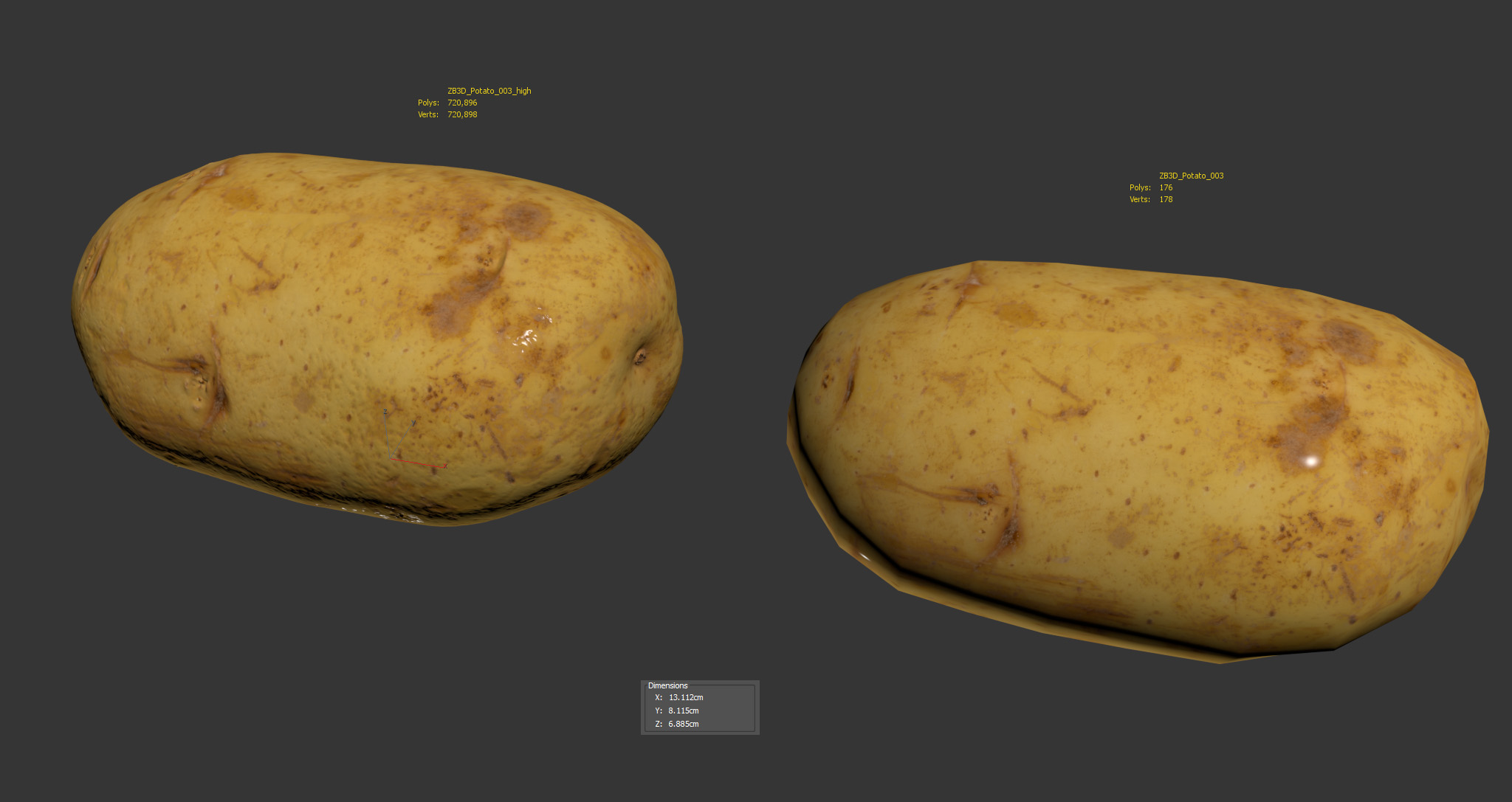 The potato model is presented as single mesh in 2 versions: low and high. Mesh is quad based. Base low model polycount is 176. High detail model included in .max, .fbx, .c4d, .stl and .obj formats. High detail model has 720k quads.