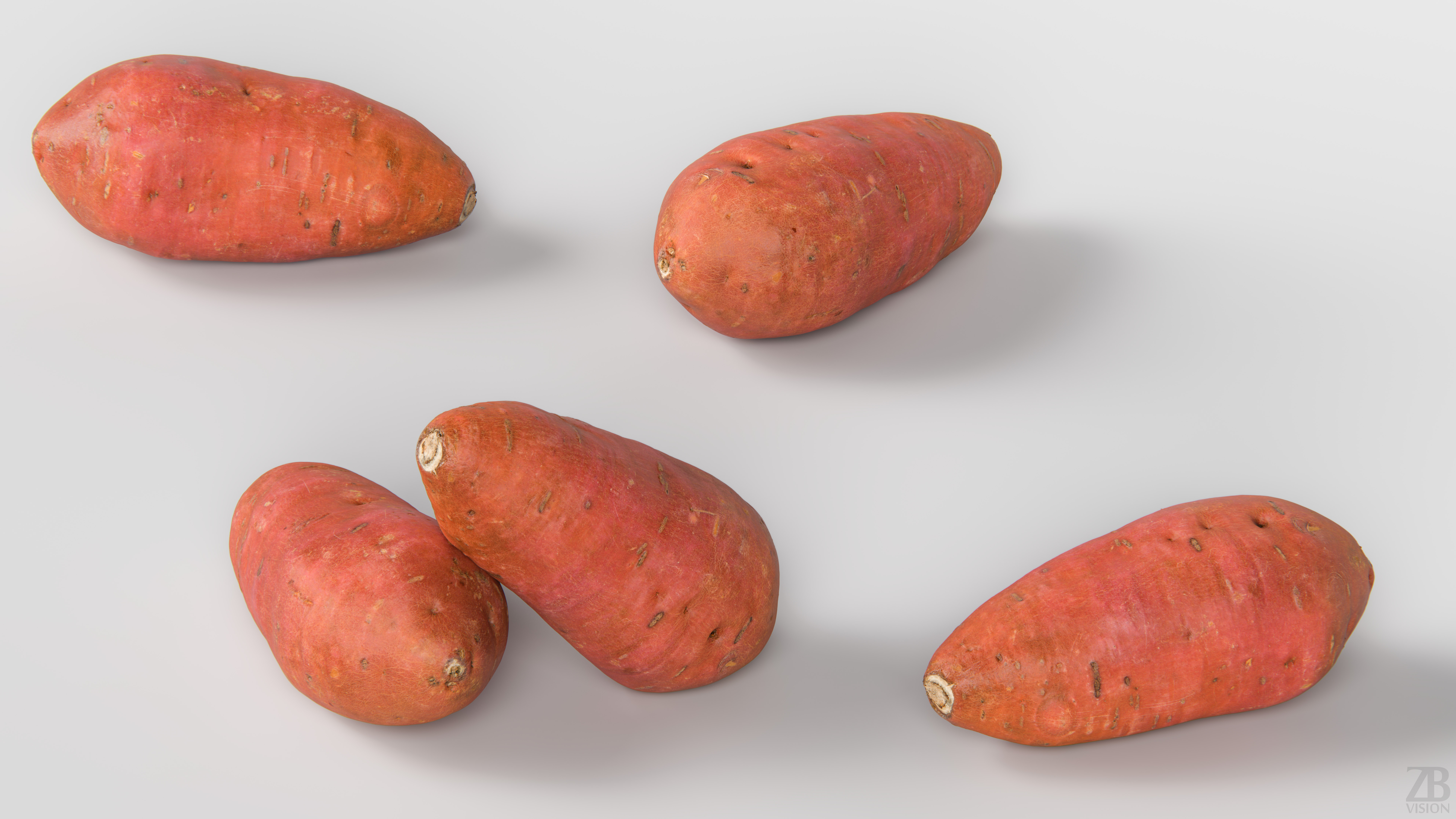 5 maps are supplied with this model. 8192×8192 PNGs and downsampled versions in 2048×2048 JPGs. The maps include ao, diffuse, glossiness, normal and displacement(tif). A 16K diffuse texture map is also included. The sweet potato model is uvw unwrapped.