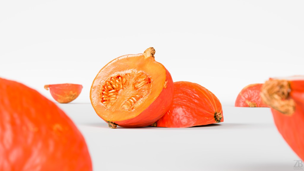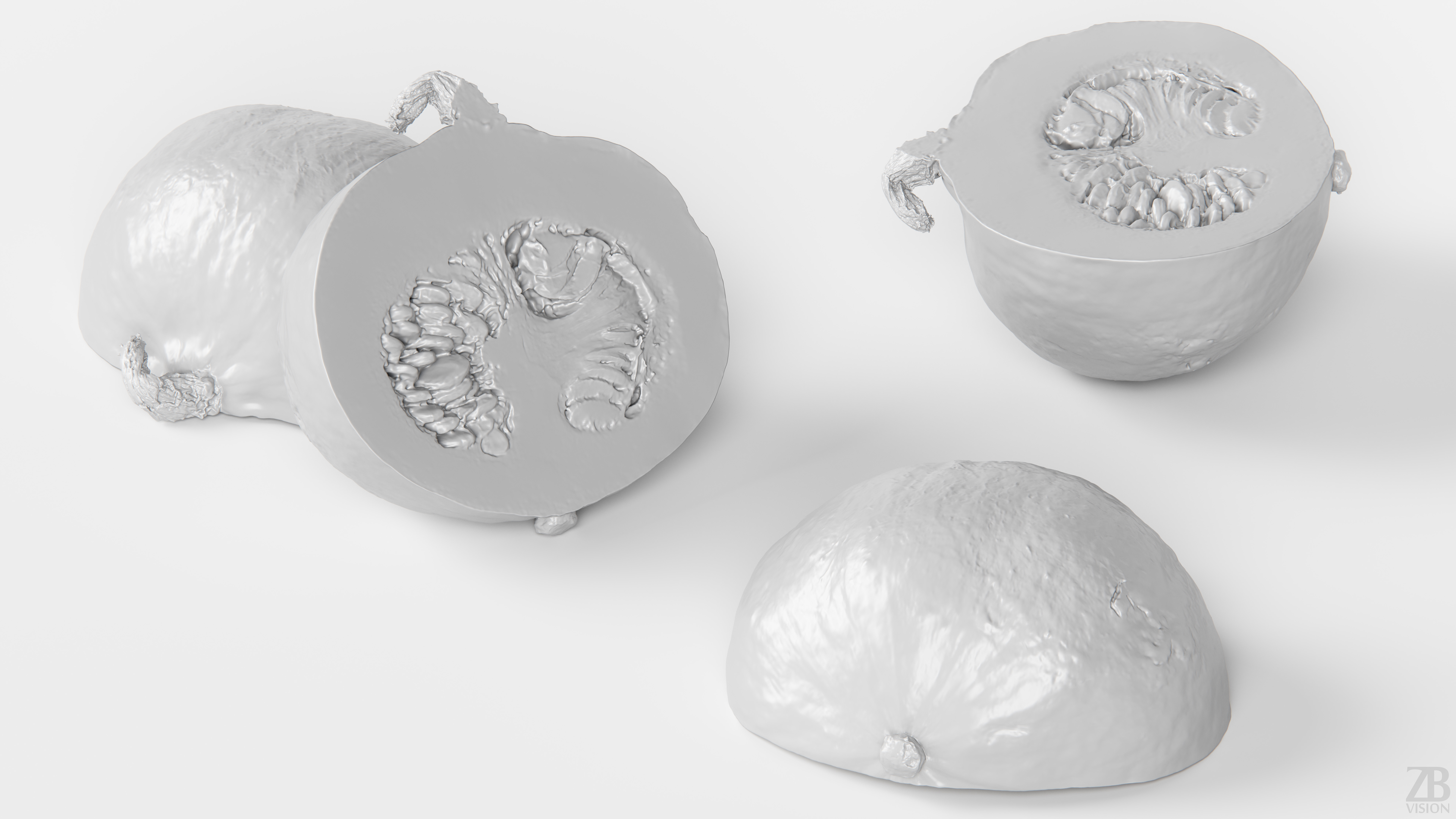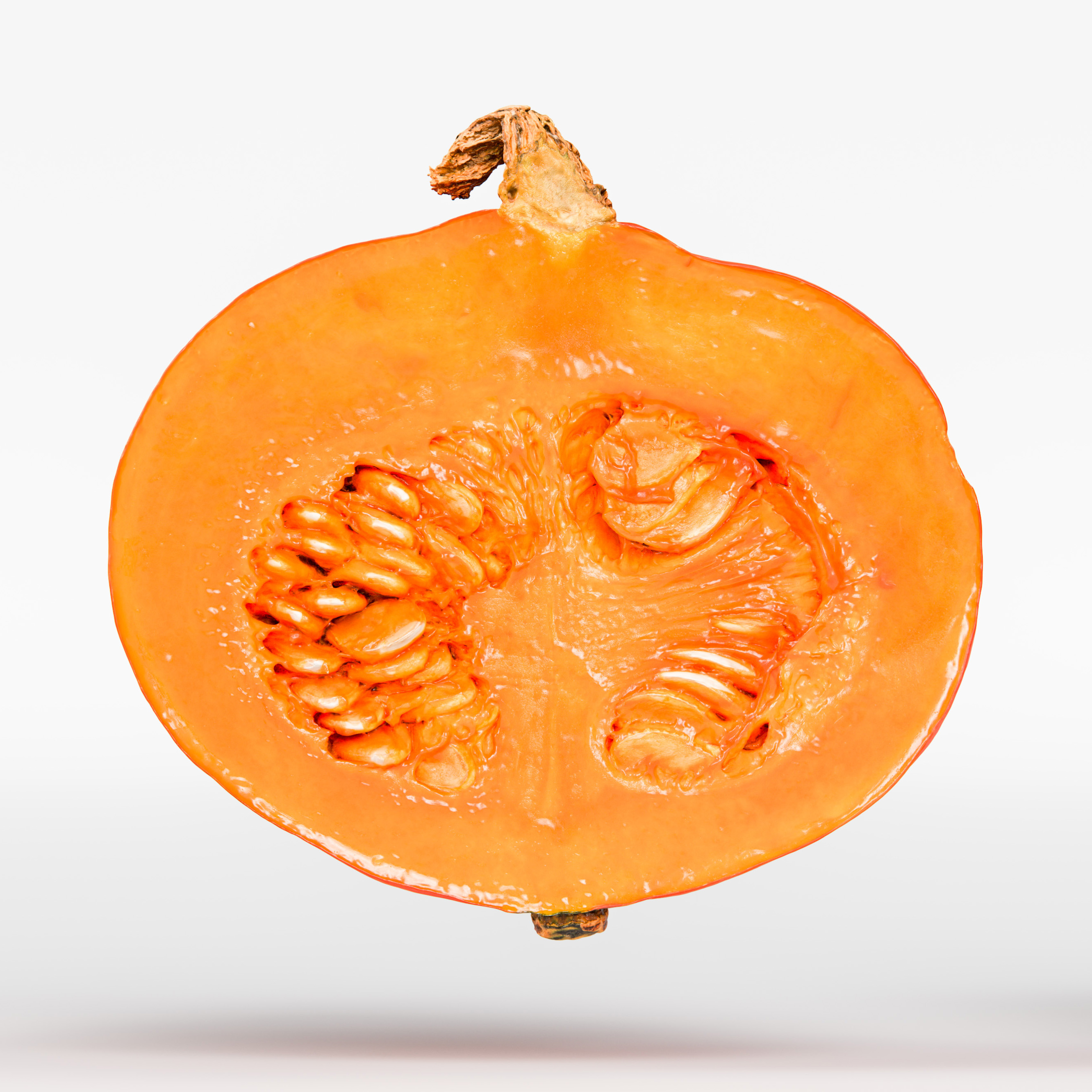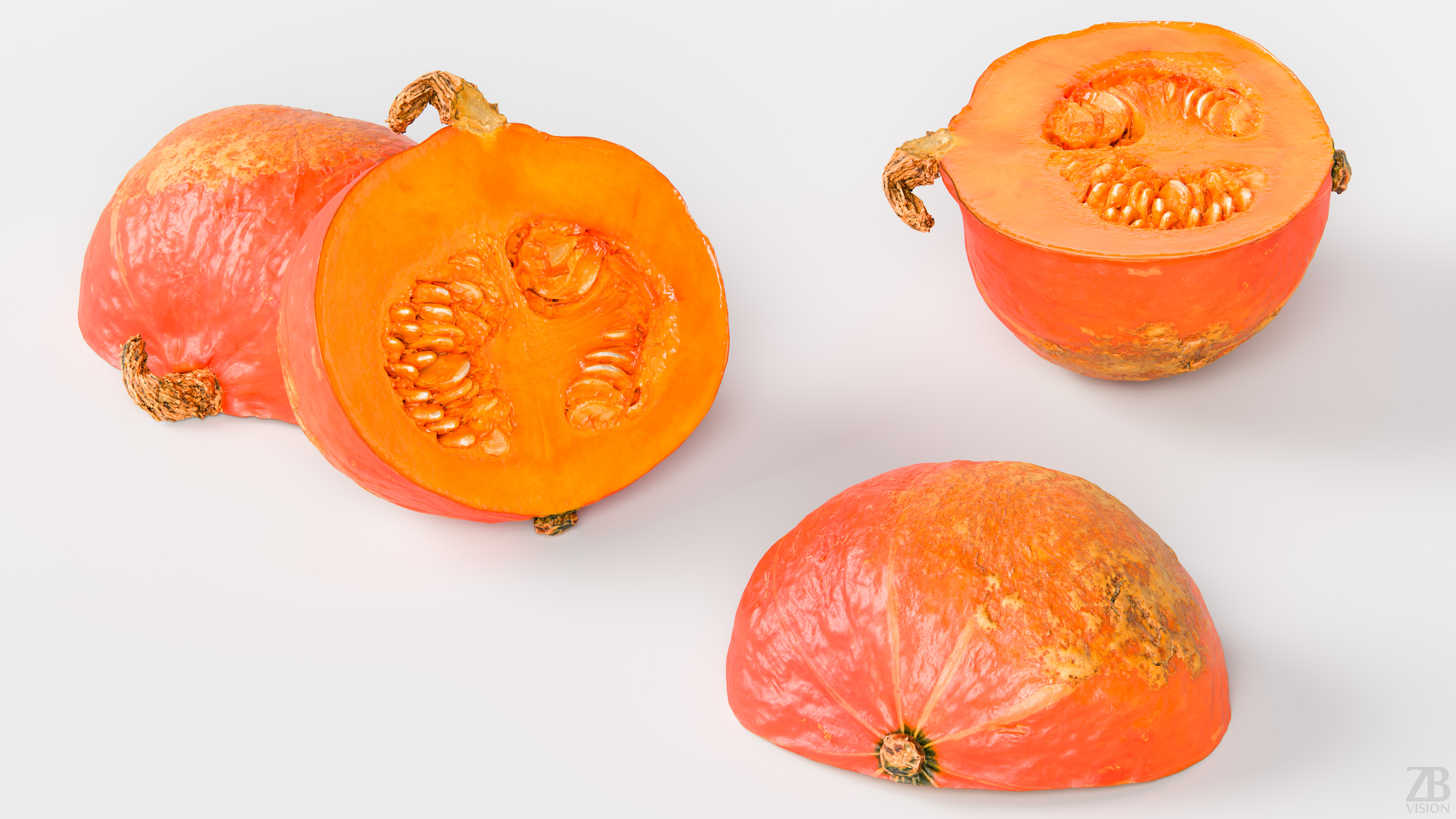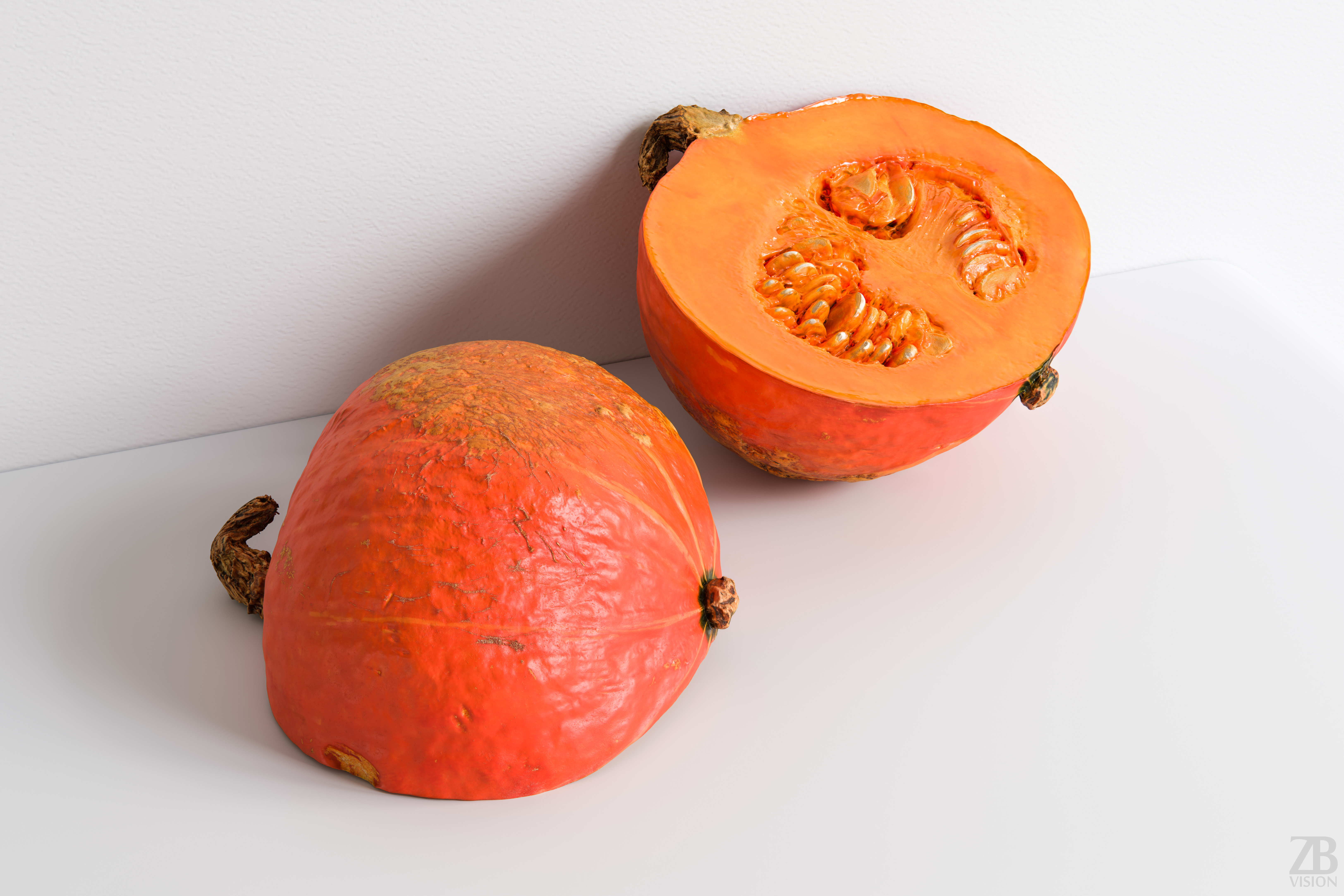 This is a 3d model of pumpkin cut in half, hokkaido variety . It was scanned and prepared for photorealistic renderings, close-ups, stills and animation. The half pumpkin model is ready to be inserted in your scene out of the box.