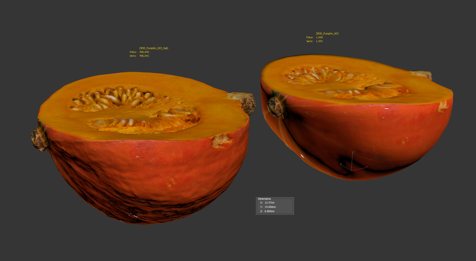 The kuri half pumpkin model is presented as single mesh in 2 versions: low and high. Mesh is quad based. Base low model polycount is 1940. High detail model included in .max, .fbx, .c4d, .stl and .obj formats. High detail model has 496 sk quads.
