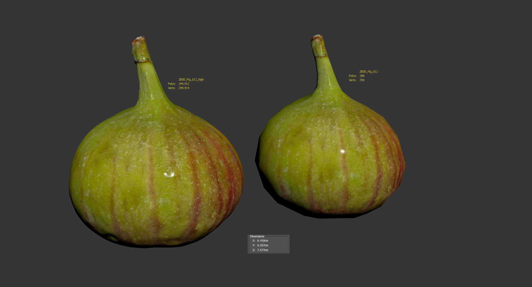 The fig model is presented as single mesh in 2 versions: low and high. Mesh is quad based. Base low model polycount is 288. High detail model included in .max, .fbx, .c4d, .stl and .obj formats. High detail model has 294k quads.