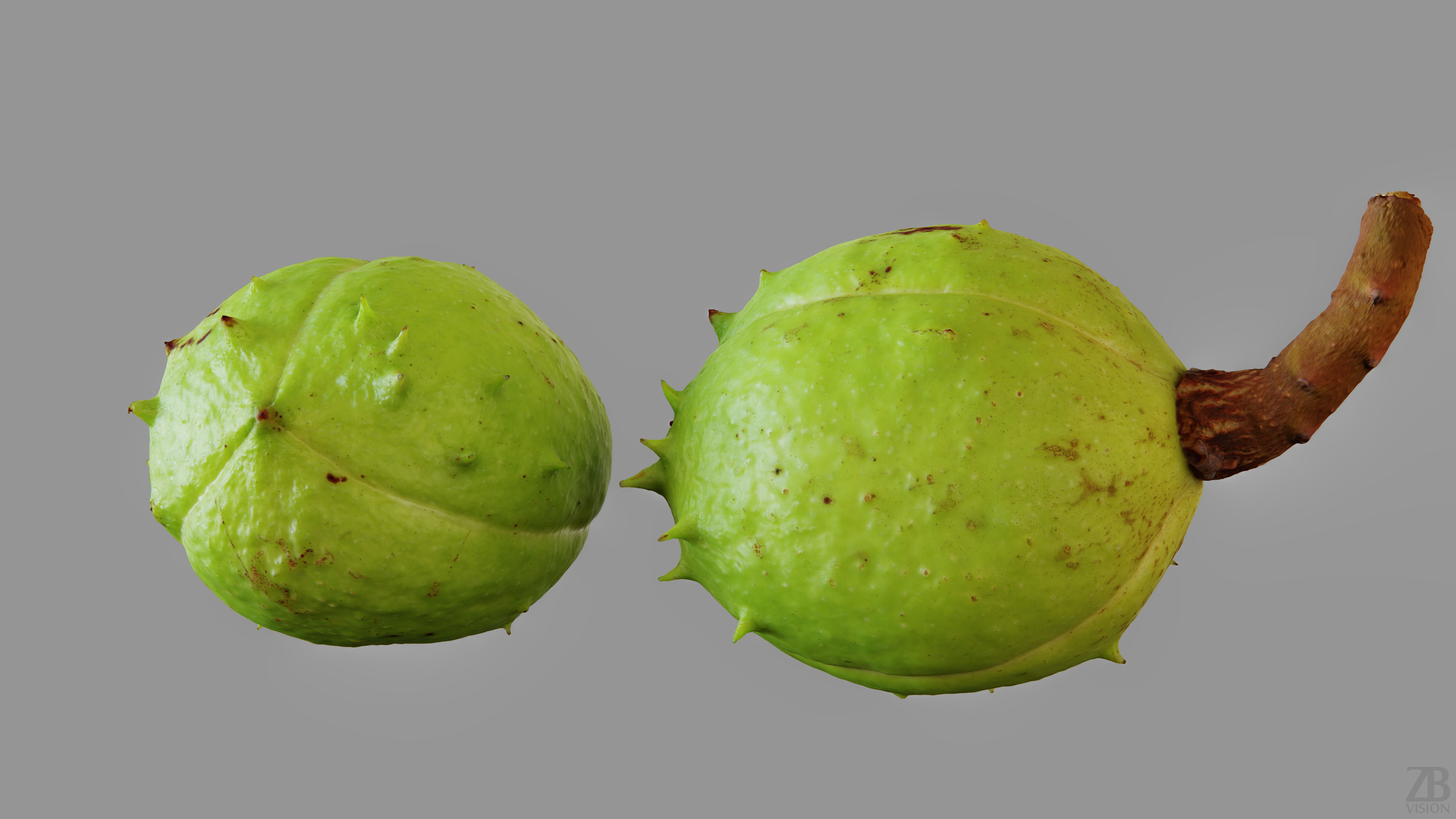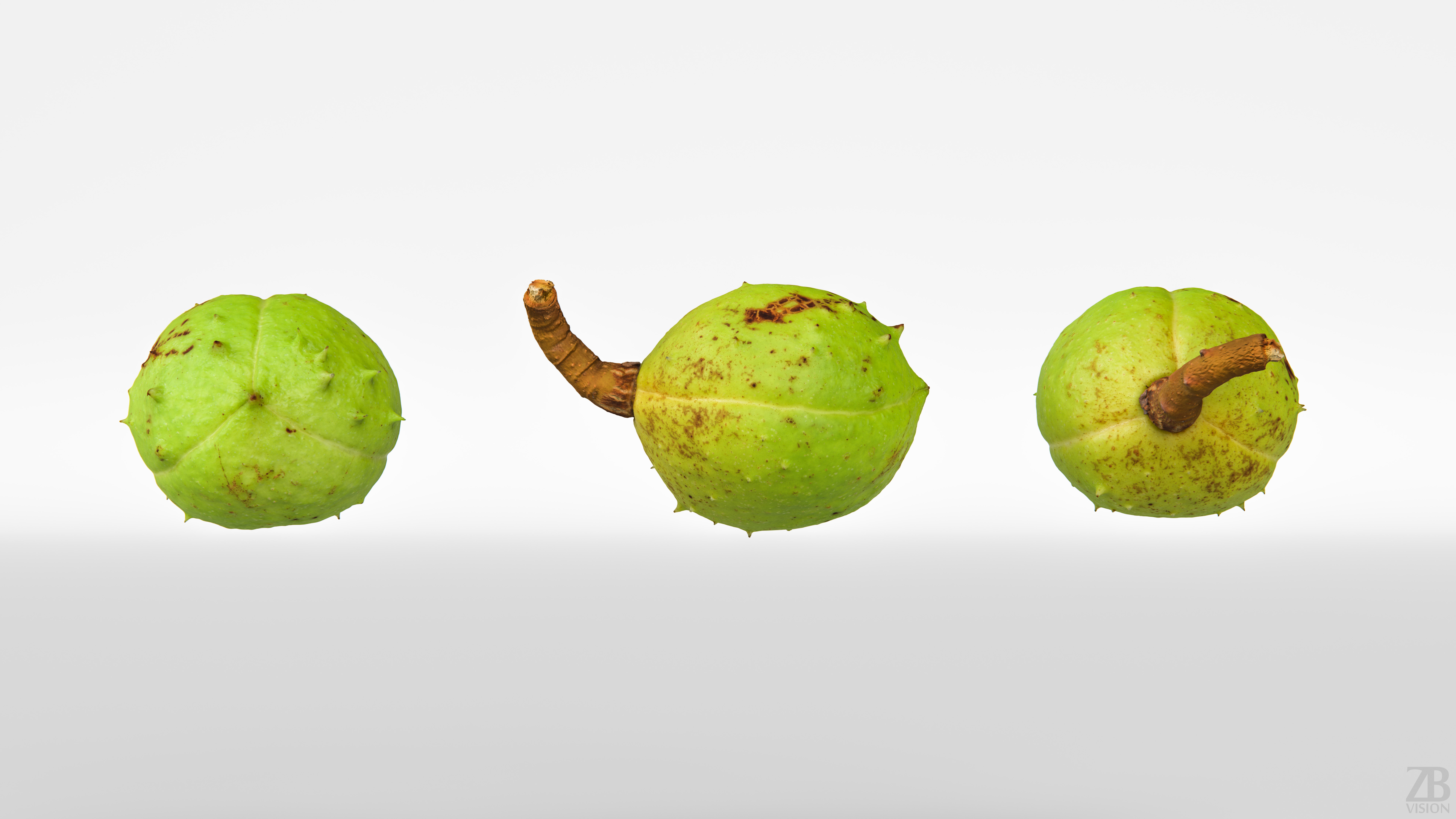 5 maps are supplied with this model. 8192×8192 PNGs and downsampled versions in 2048×2048 JPGs. The maps include ao, diffuse, glossiness, normal and displacement(tif). A 16K diffuse texture map is also included. The chestnut pod model is uvw unwrapped.