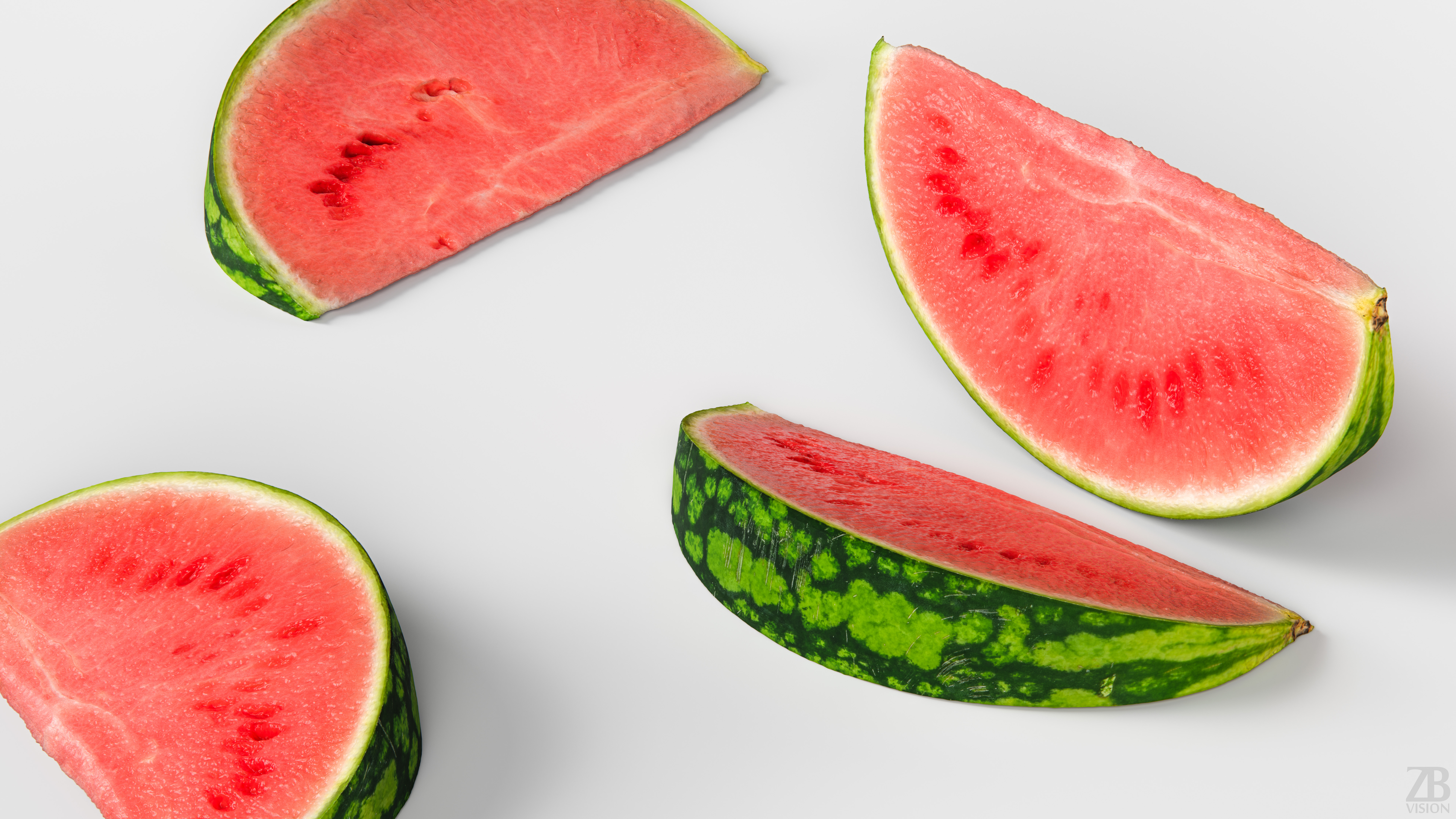 5 maps are supplied with this model. 8192×8192 PNGs and downsampled versions in 2048×2048 JPGs. The maps include ao, diffuse, glossiness, normal and displacement(tif). A 16K diffuse texture map is also included. The watermelon slice model is uvw unwrapped.