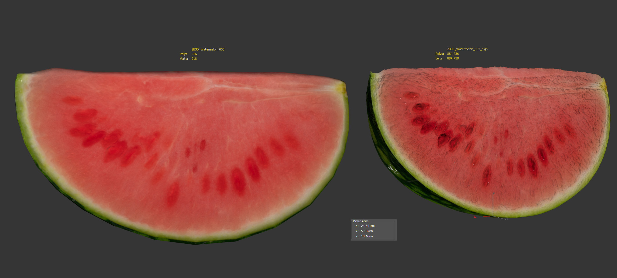 The watermelon model is presented as single mesh in 2 versions: low and high. Mesh is quad based. Base low model polycount is 216. High detail model included in .max, .fbx, .c4d, .stl and .obj formats. High detail model has 884k quads.