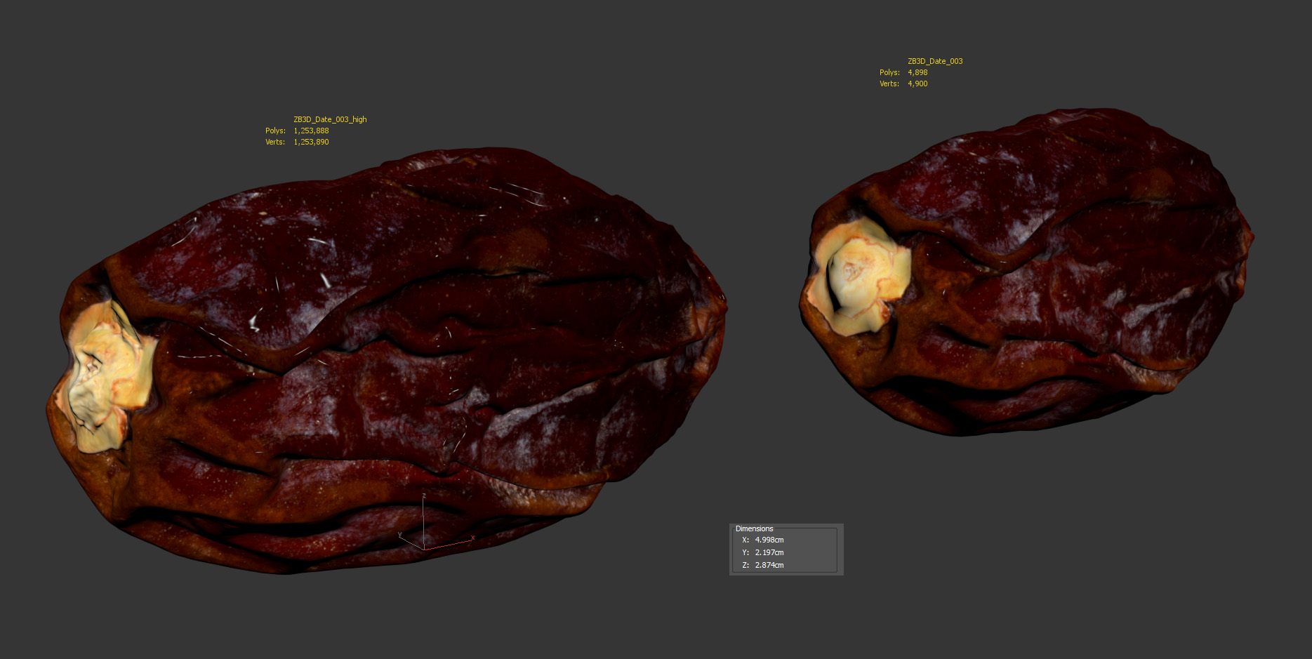 5 maps are supplied with this model. 8192×8192 PNGs and downsampled versions in 2048×2048 JPGs. The maps include ao, diffuse, glossiness, normal and displacement(tif). A 16K diffuse texture map is also included. The date fruit slice model is uvw unwrapped.