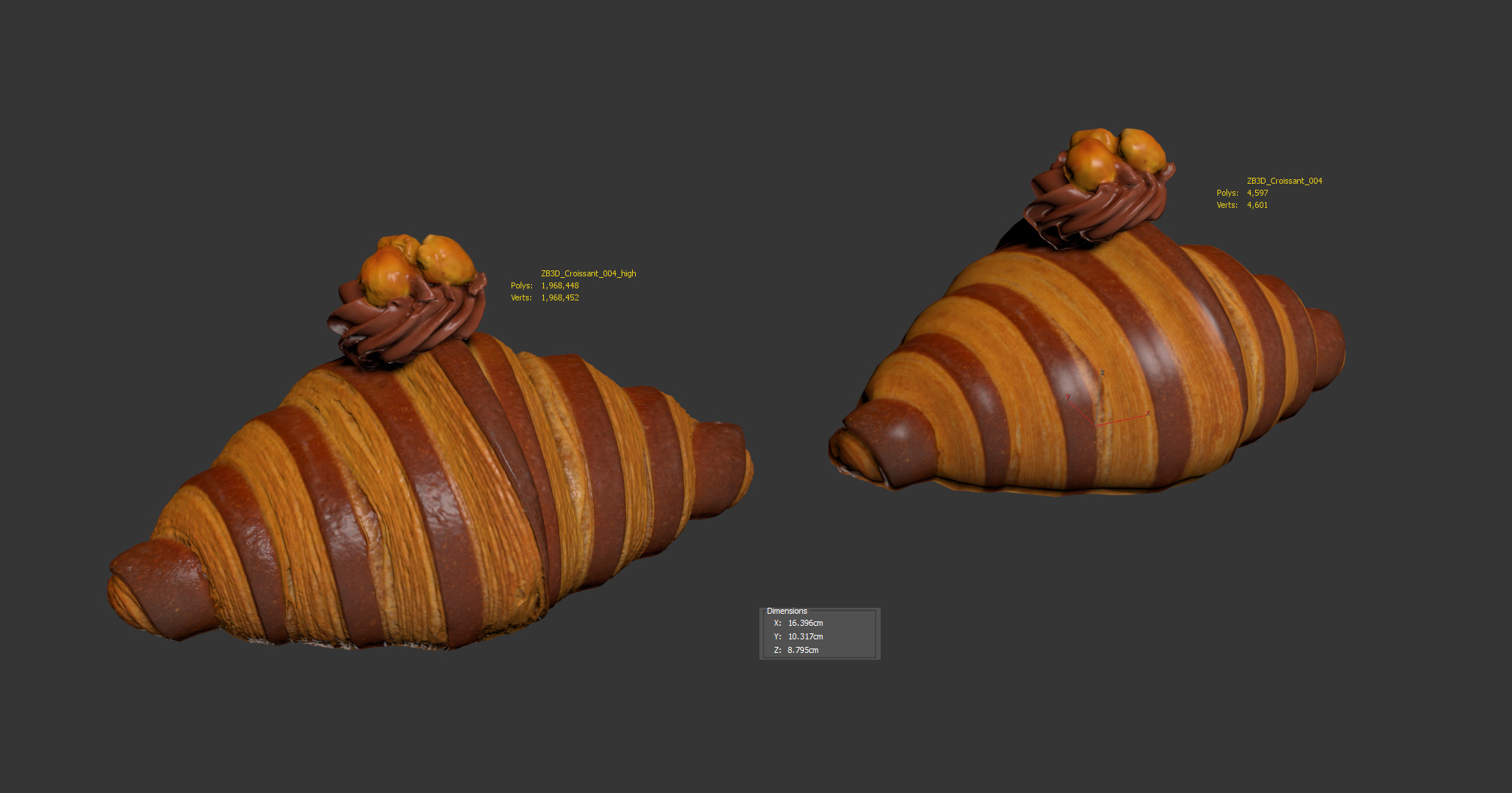 The croissant model is presented as single mesh in 2 versions: low and high. Mesh is quad based. Base low model polycount is 4597. High detail model included in .max, .fbx, .c4d, .stl and .obj formats. High detail model has 1968k quads. Cream and bun meshes are separate and can be detached/deleted.