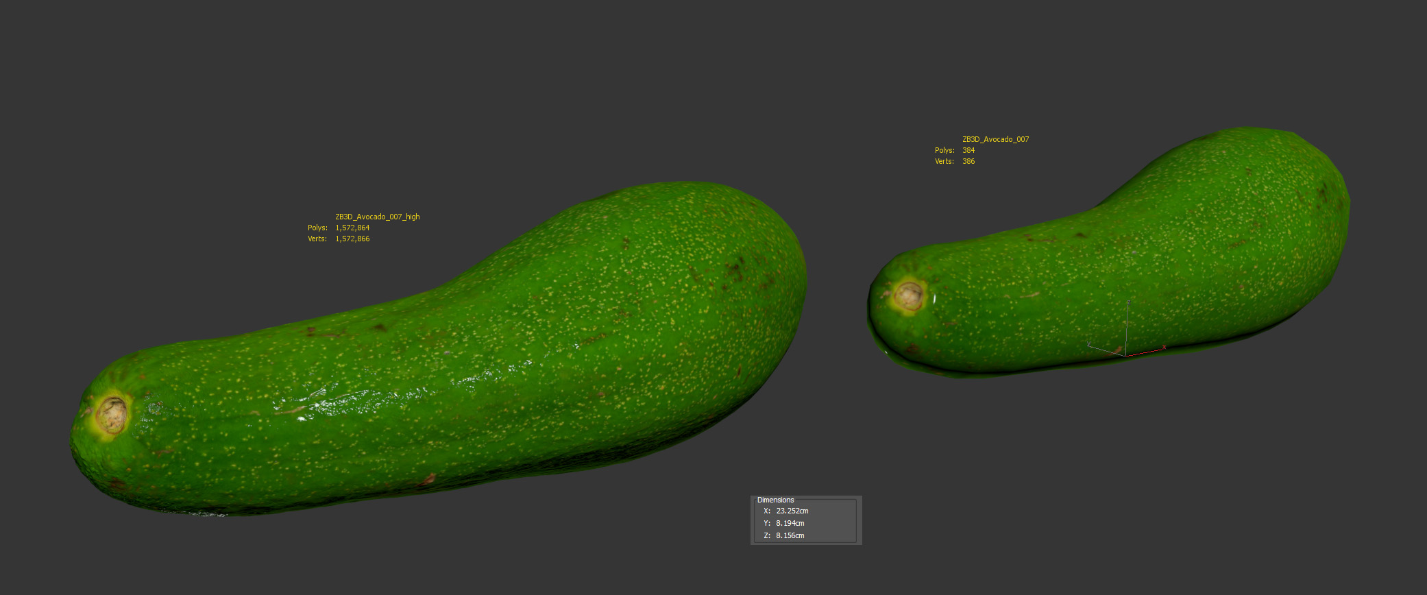 The avocado model is presented as single mesh in 2 versions: low and high. Mesh is quad based. Base low model polycount is 384. High detail model included in .max, .fbx, .c4d, .stl and .obj formats. High detail model has 1572k quads.