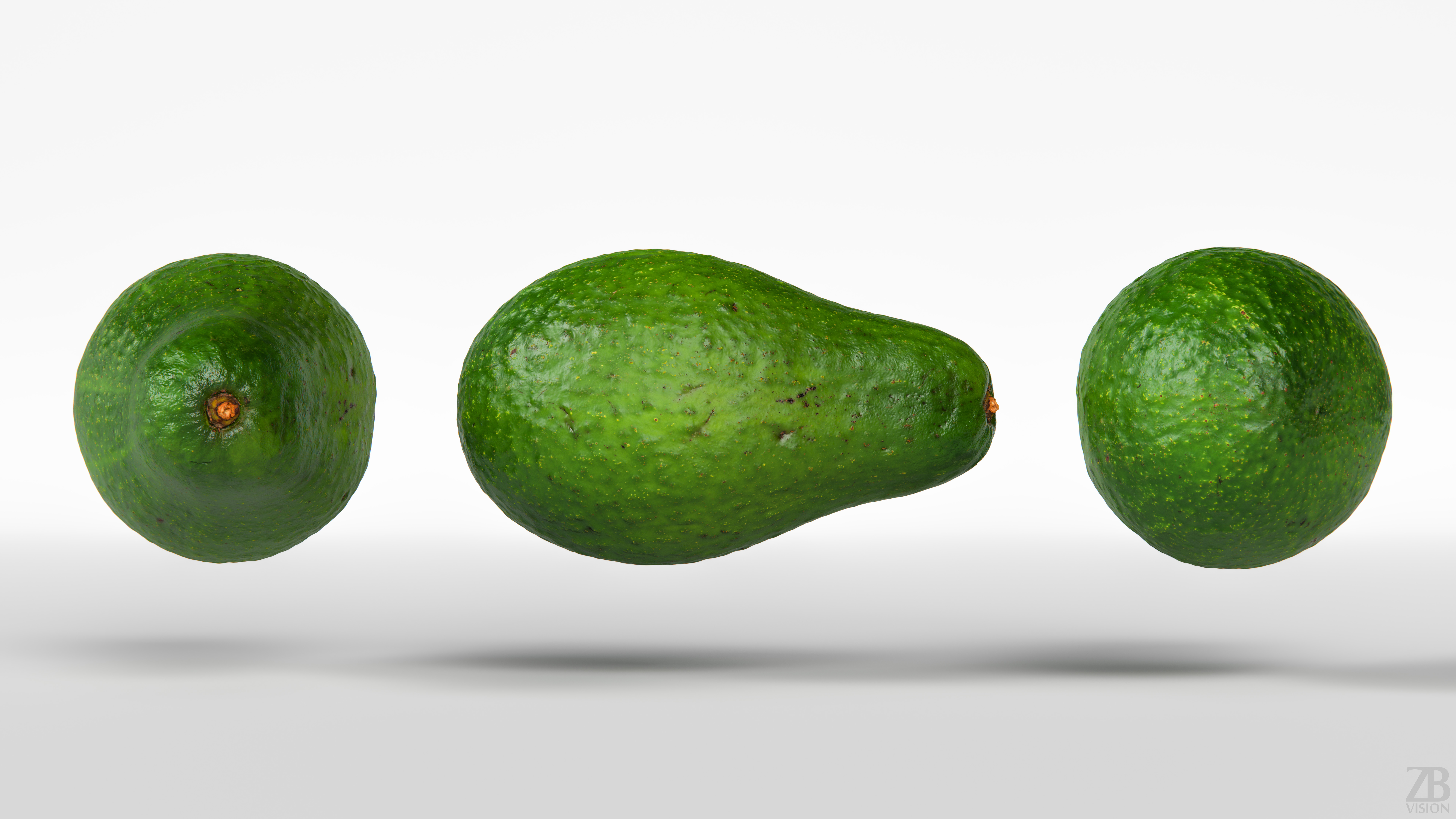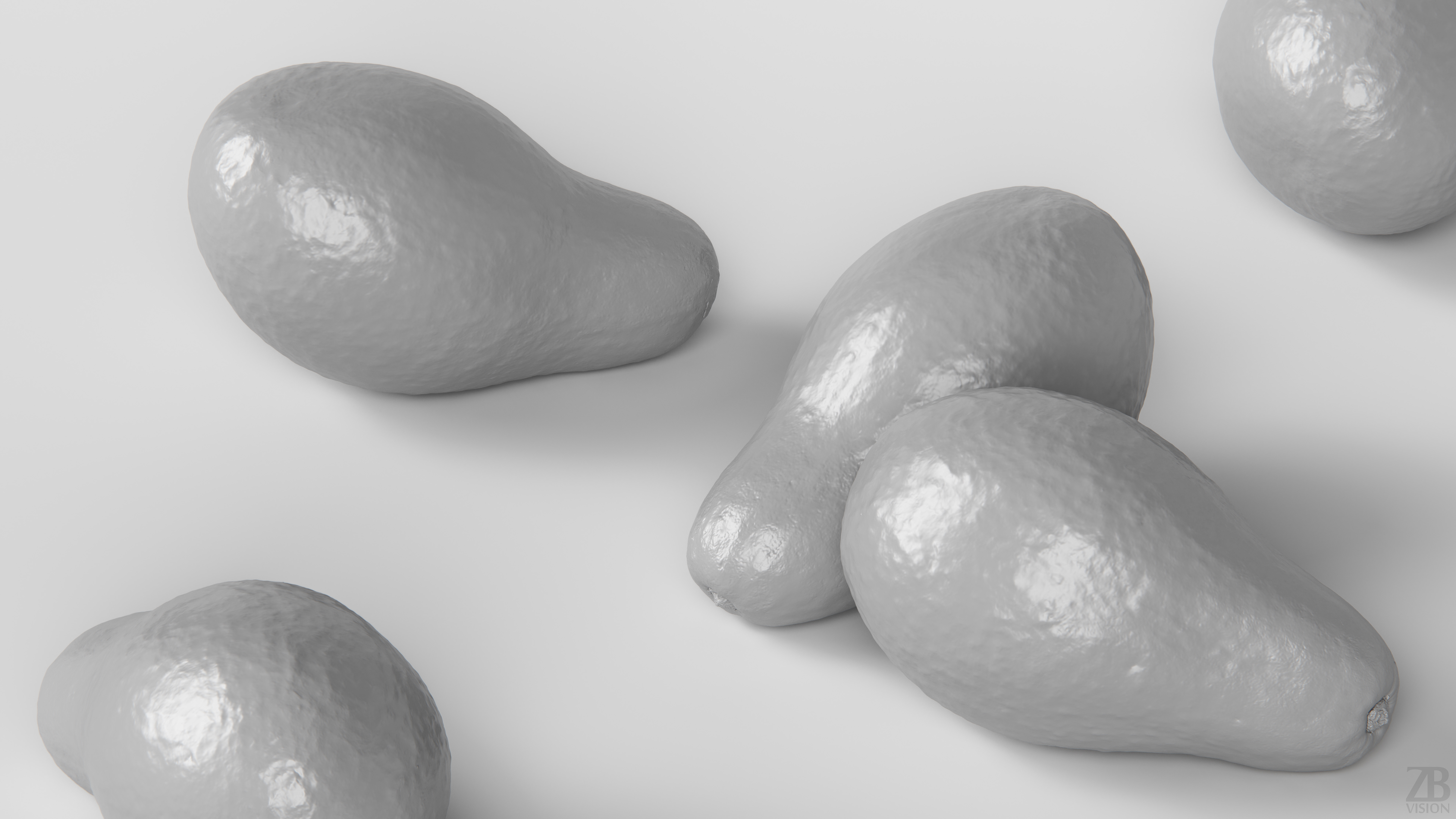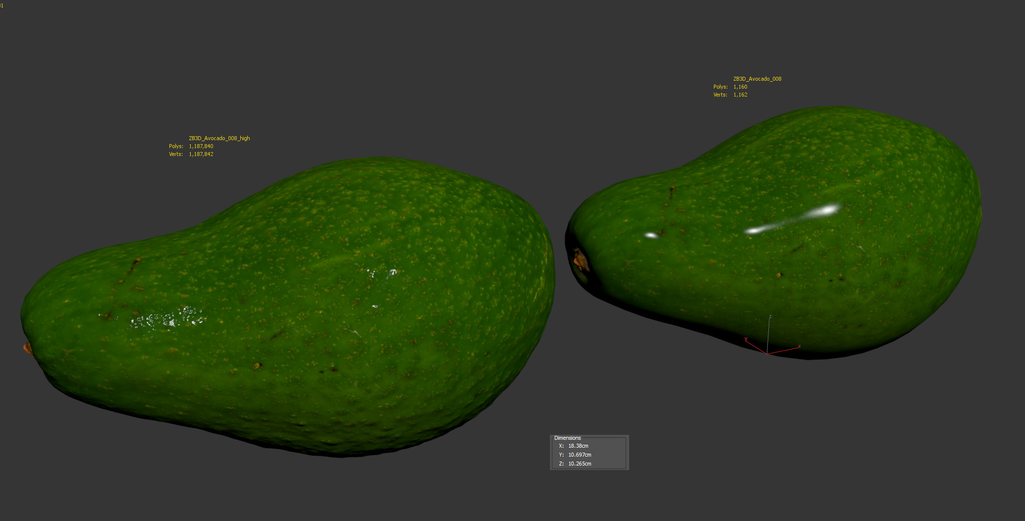 The avocado model is presented as single mesh in 2 versions: low and high. Mesh is quad based. Base low model polycount is 1160. High detail model included in .max, .fbx, .c4d, .stl and .obj formats. High detail model has 1187k quads. The raw scan of about 15 mil triangles is also included in OBJ format.