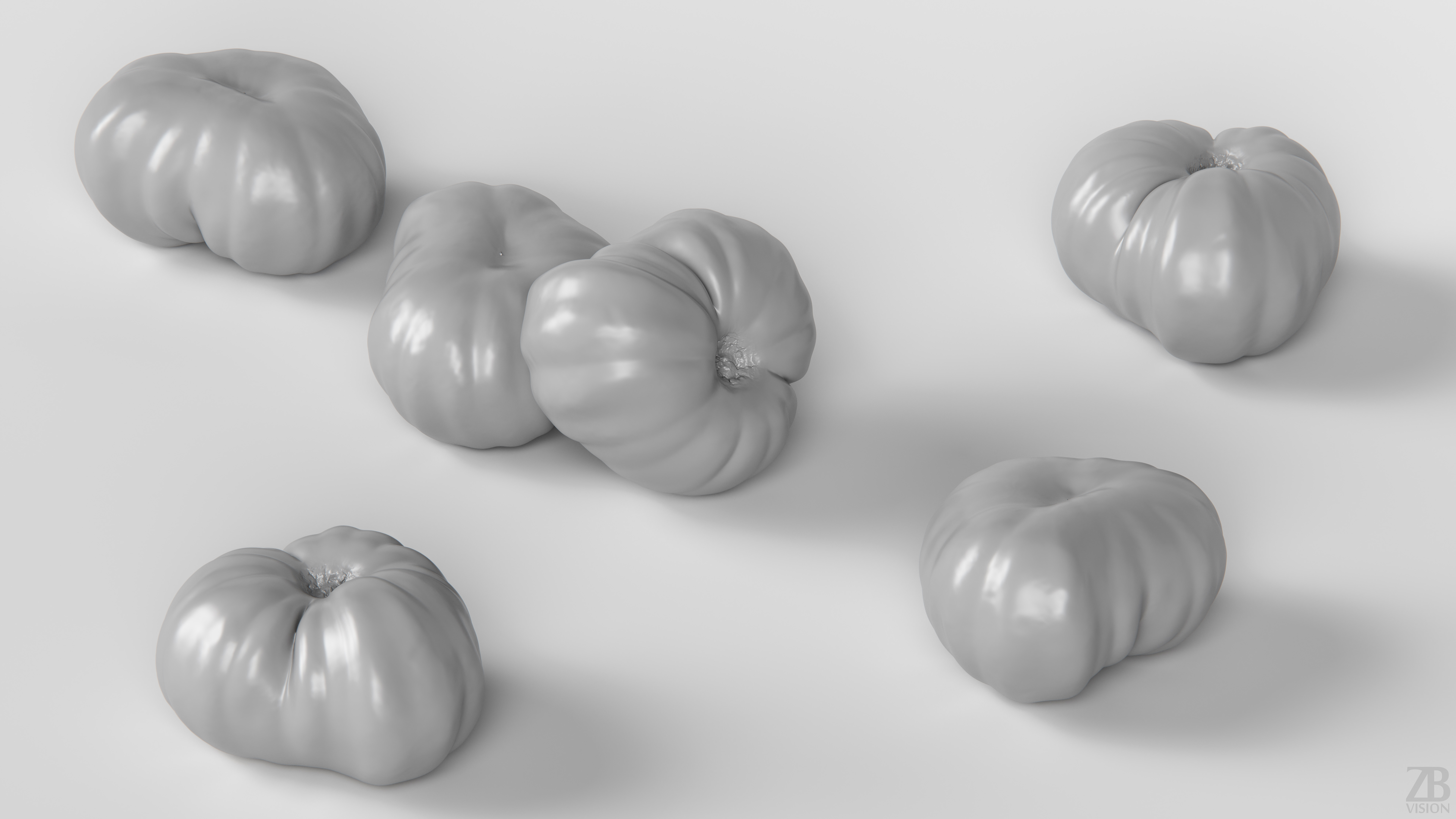 The tomato model is presented as single mesh in 2 versions: low and high. Mesh is quad based. Base low model polycount is 512. High detail model included in .max, .fbx, .c4d, .stl and .obj formats. High detail model has 524k quads. The raw scan of about 14.7 mil triangles is also included in OBJ format.