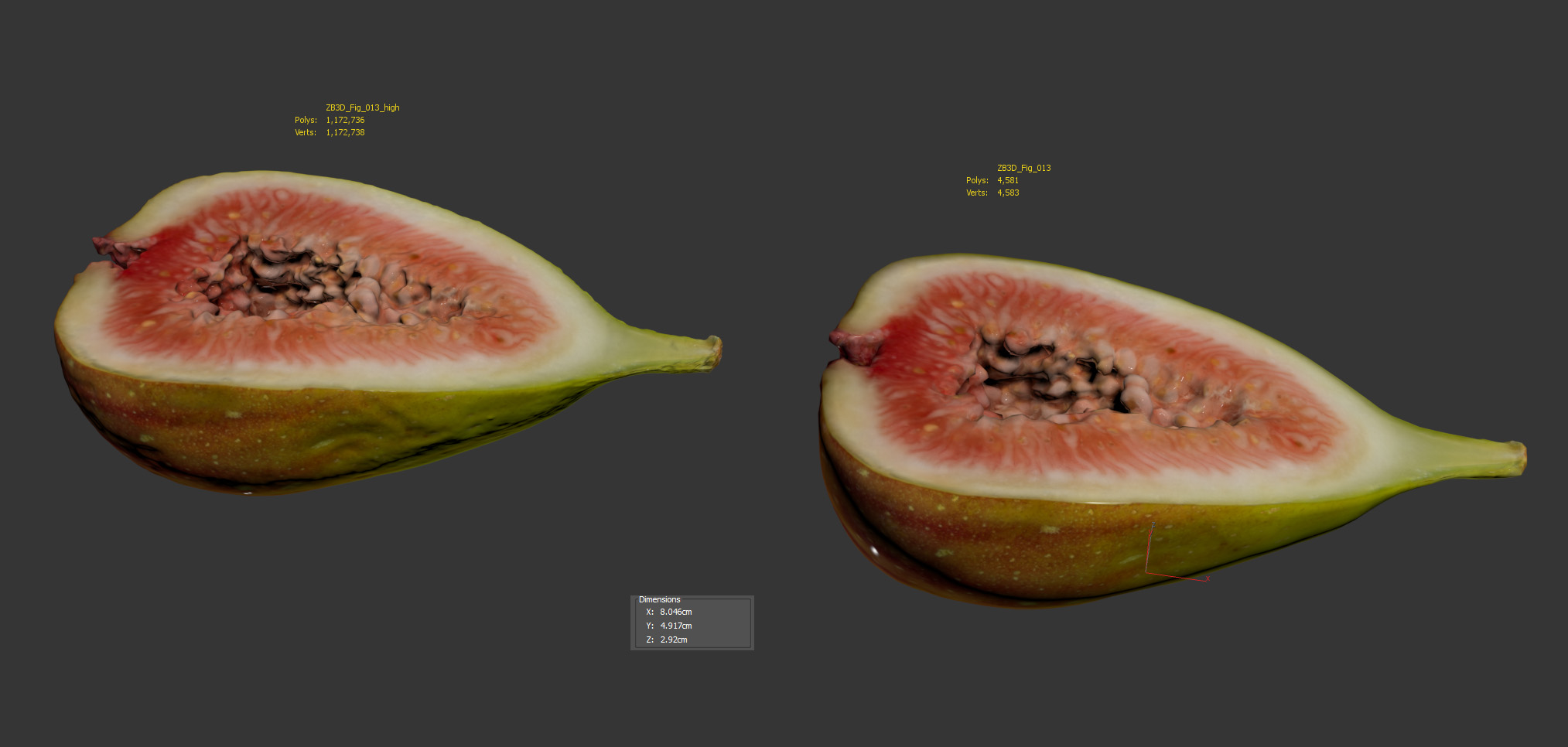 The half fig model is presented as single mesh in 2 versions: low and high. Mesh is quad based. Base low model polycount is 4581. High detail model included in .max, .fbx, .c4d, .stl and .obj formats. High detail model has 1172k quads.
